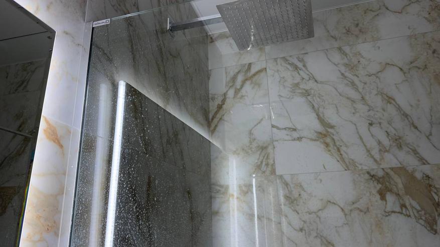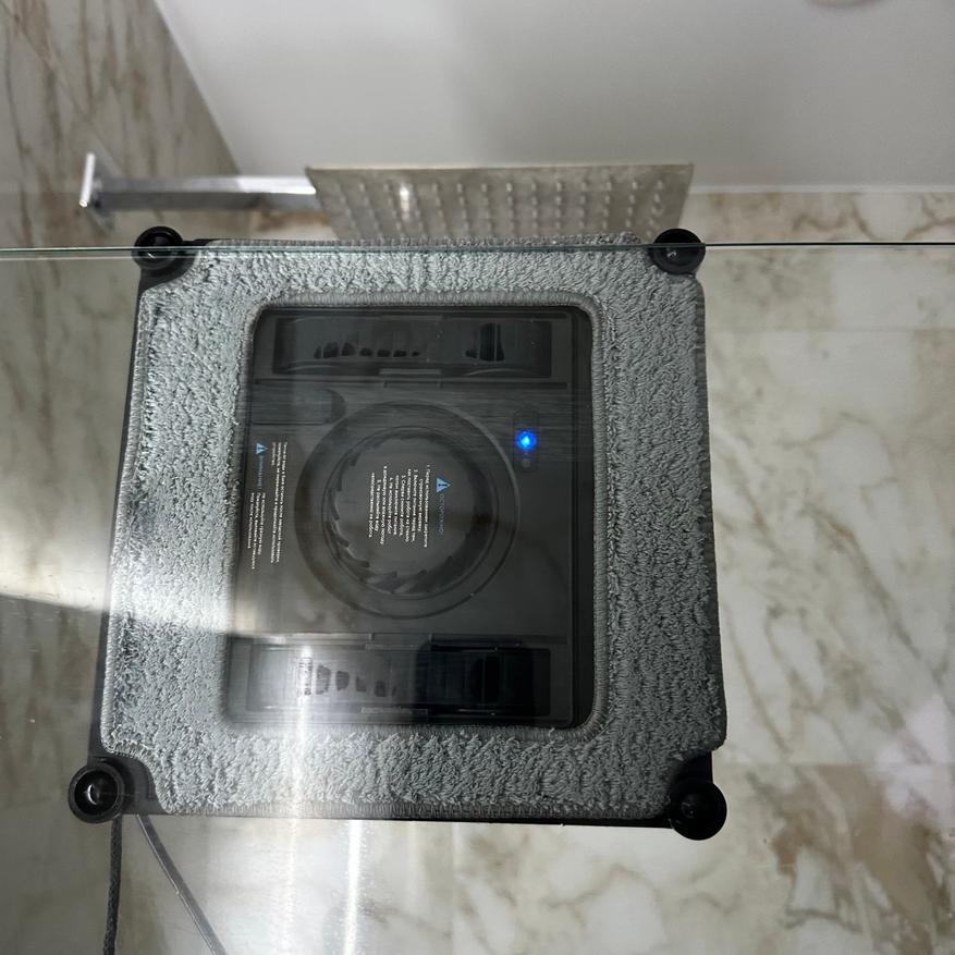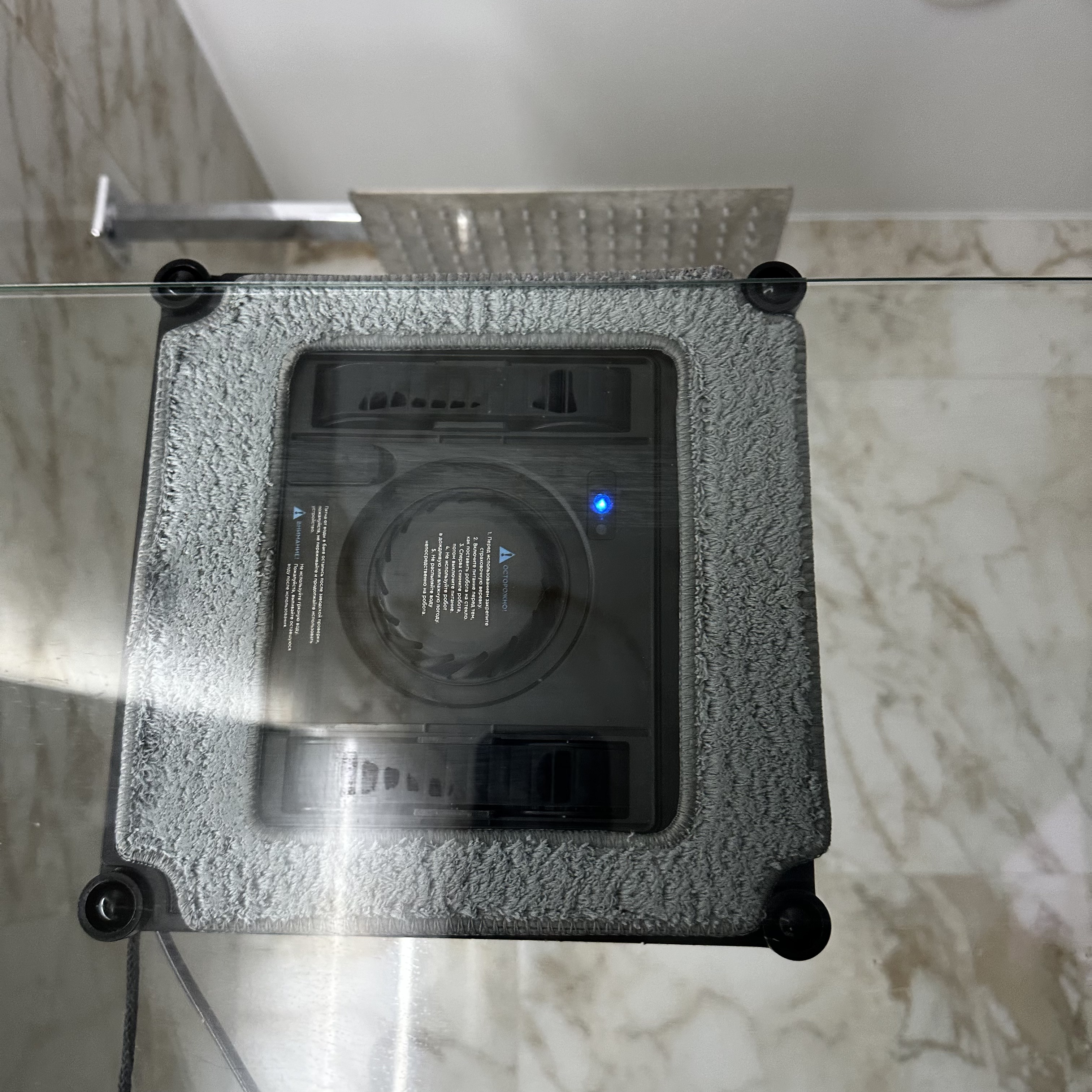 На окнах решили не останавливаться. Следующей на очереди была стеклянная перегородка в ванной. Поверхность без рамок, но робот чётко определил края. Датчики отработали без сбоев, устройство двигалось по Z-образной траектории (в этот раз запускала с кнопки на корпусе) и ни разу не попыталось соскользнуть. Поскольку на стекле были известковые подтёки, запустили два прохода. Результат снова порадовал: поверхность чистая по всей площади, включая участки у краёв. Дополнительно протестировали вертикальное движение в режиме N, прижим надёжный, траектория ровная, поведение стабильно.