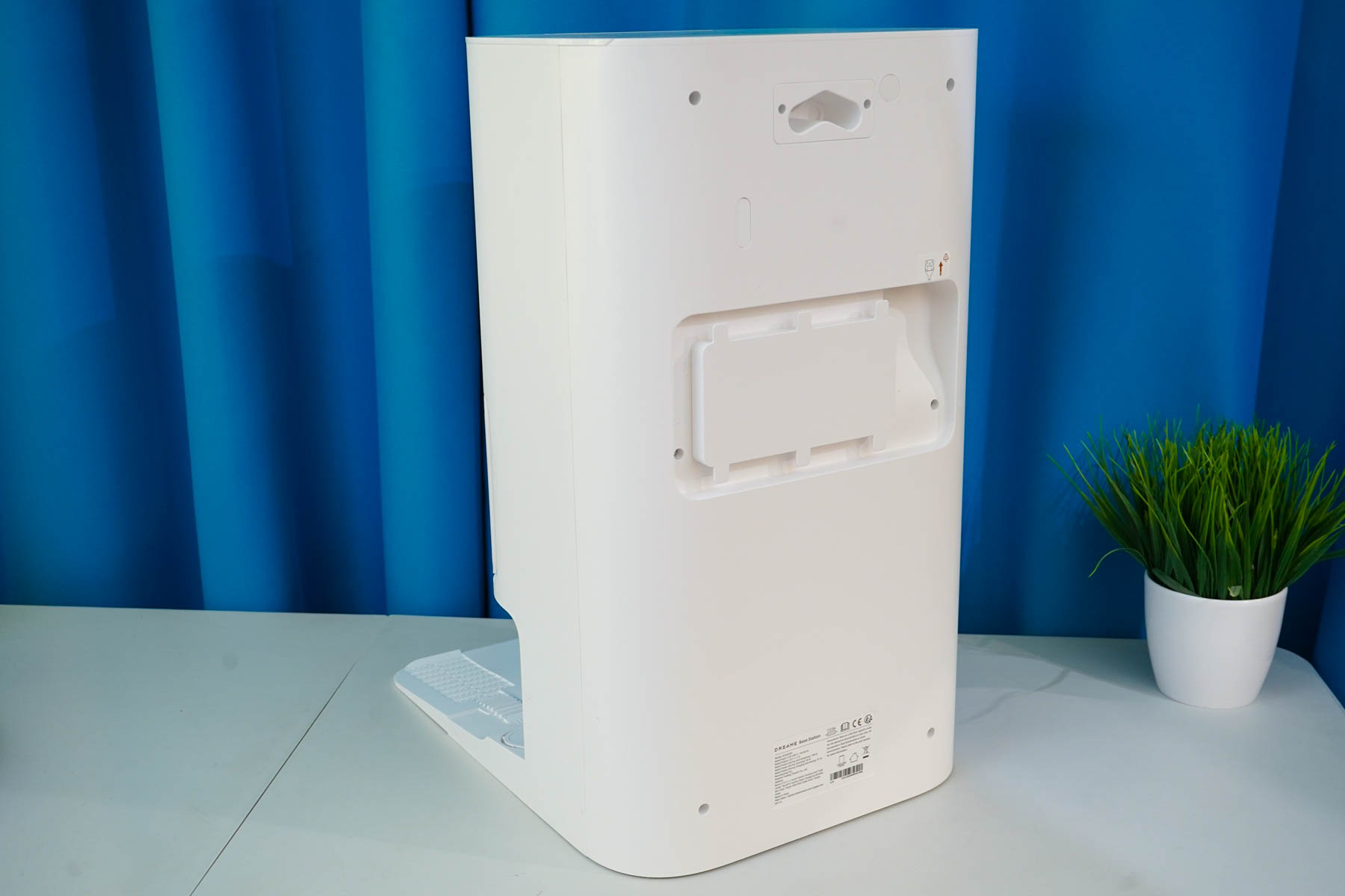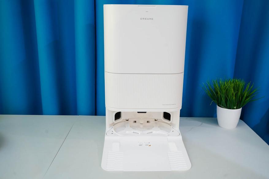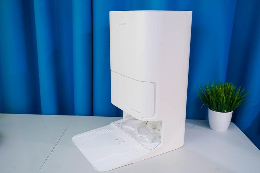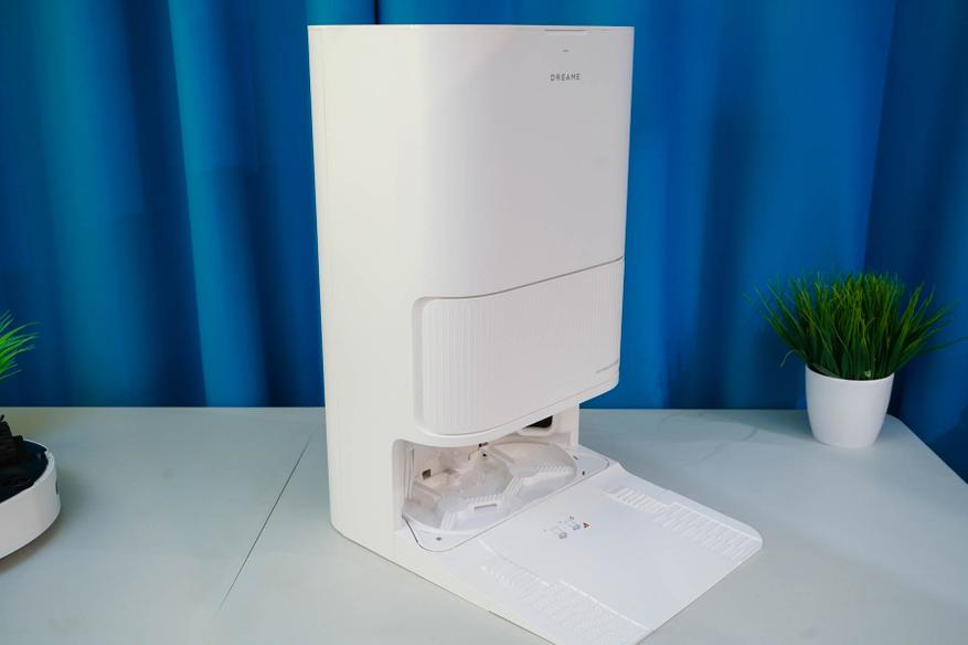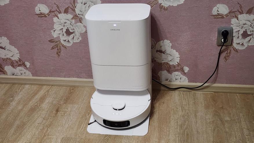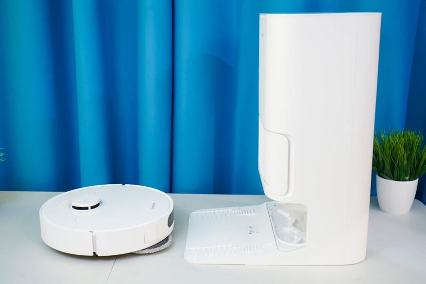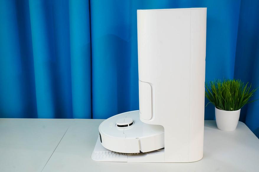 Станция же, напротив, обладает солидными размерами (примерно 59x45x34 см) и весом (около 9 кг, с жидкостями может достигать ~ 15 кг), что имеет смысл учитывать при выборе постоянного места для ее установки. Это получается полноценный элемент интерьера или бытовой прибор, а просто «док» для подзарядки. Фактически, такая станция не только заряжает аккумулятор, но и автоматически опорожняет пылесборник, моет и сушит салфетки, а также пополняет запасы чистой воды перед влажной уборкой. Также отмечу, что матовый белый пластик корпуса станции (как и самого робота) позволяет гармонично вписаться практически в любой интерьер.