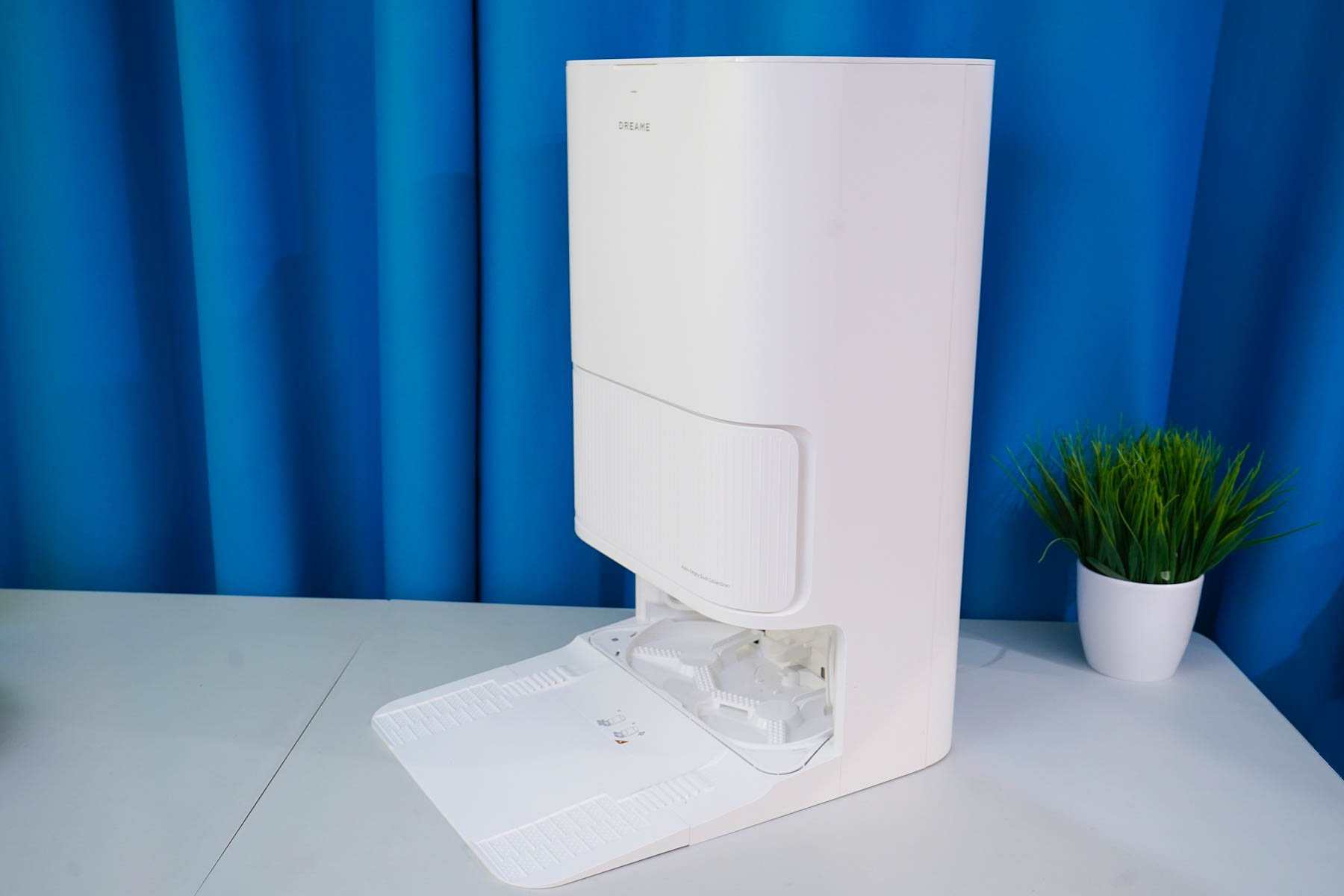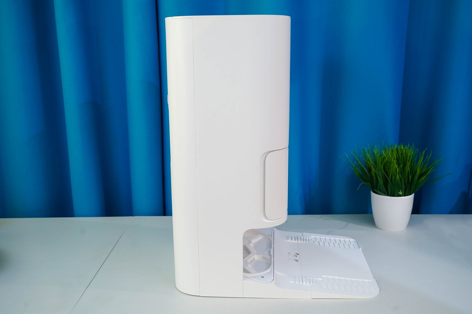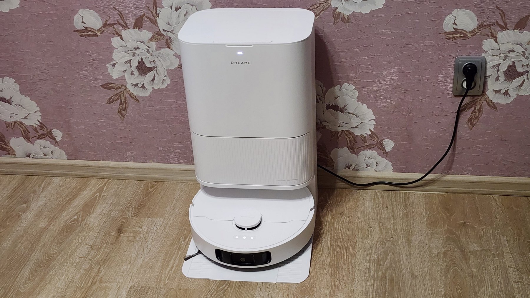 Станция же, напротив, обладает солидными размерами (примерно 59x45x34 см) и весом (около 9 кг, с жидкостями может достигать ~ 15 кг), что имеет смысл учитывать при выборе постоянного места для ее установки. Это получается полноценный элемент интерьера или бытовой прибор, а просто «док» для подзарядки. Фактически, такая станция не только заряжает аккумулятор, но и автоматически опорожняет пылесборник, моет и сушит салфетки, а также пополняет запасы чистой воды перед влажной уборкой. Также отмечу, что матовый белый пластик корпуса станции (как и самого робота) позволяет гармонично вписаться практически в любой интерьер.