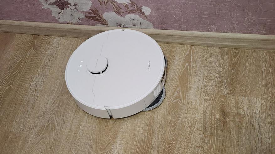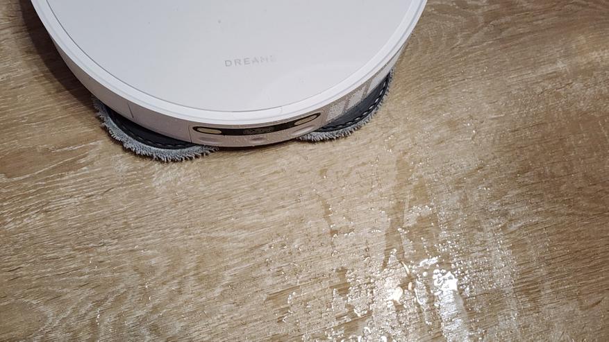 В плане уборки замечаний нет — выполняет и в автоматическом режиме, и зонную уборку (можно запускать убирать по-комнатно). Если говорить про влажную уборку, то отмечу, что две круглые салфетки вращаются, имитируя интенсивное ручное мытье. Чистота получается примерно такая же, как и после моего мытья обычной шваброй. Покрытие пола остается едва влажное, и быстро высыхает. Для керамического пола (плитка/керамогранит) можно увеличить интенсивность смачивания, для паркета/ламината — уменьшить.