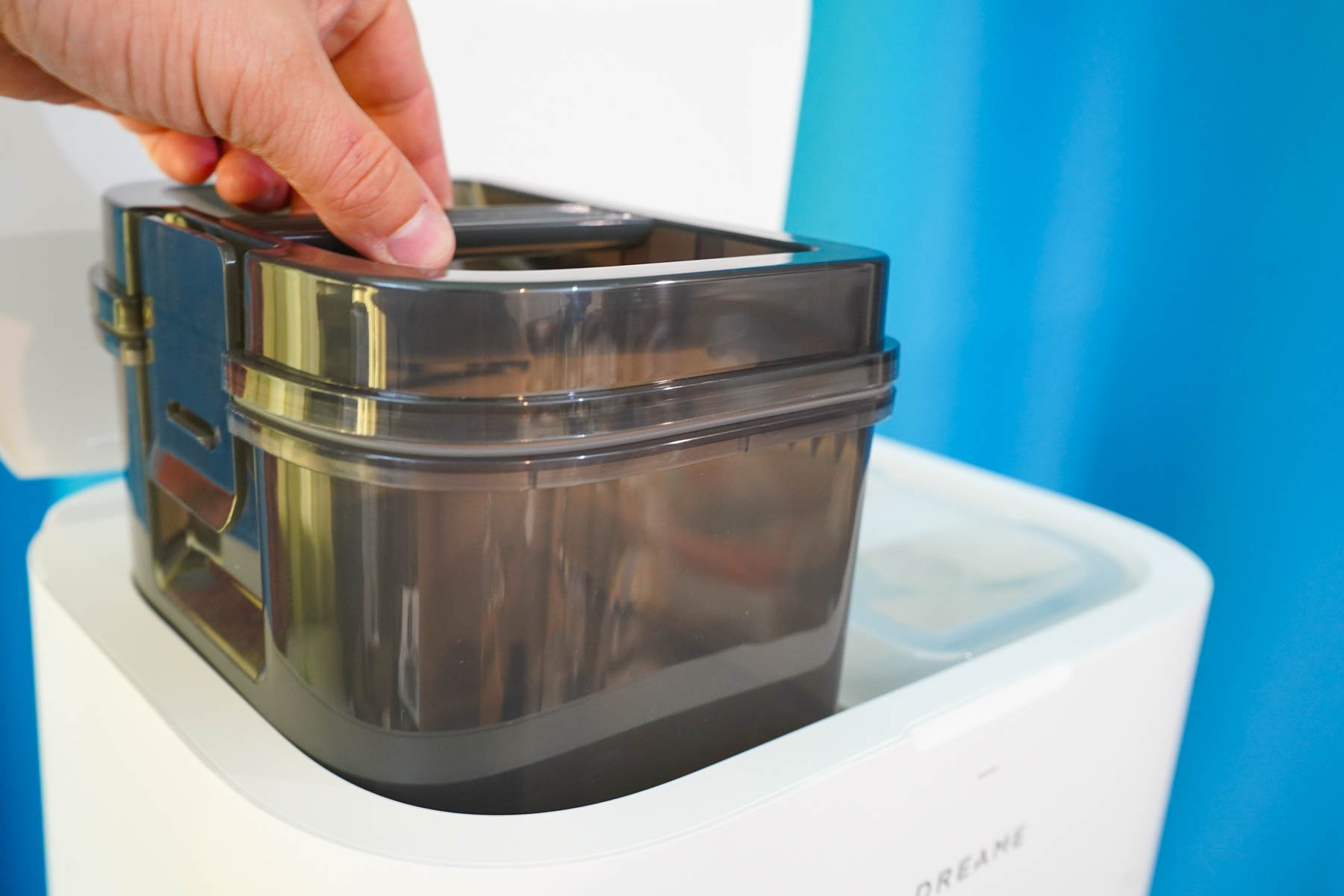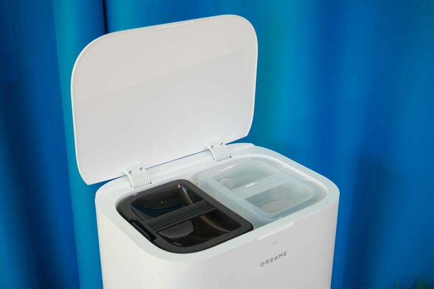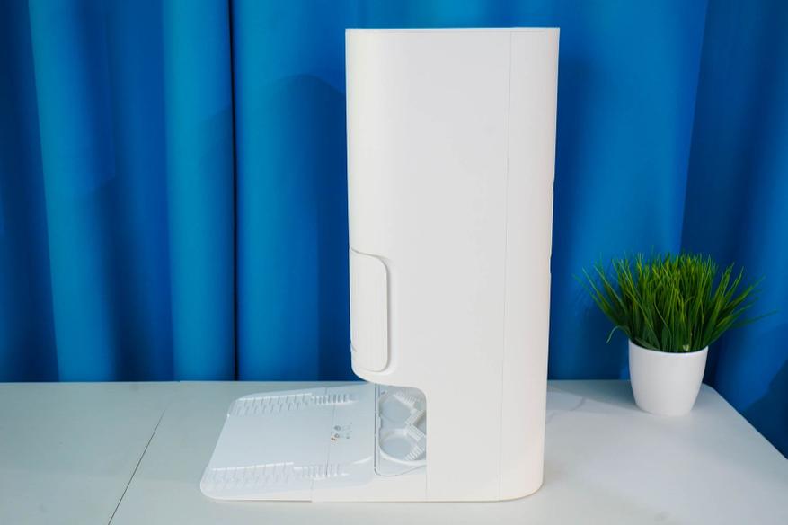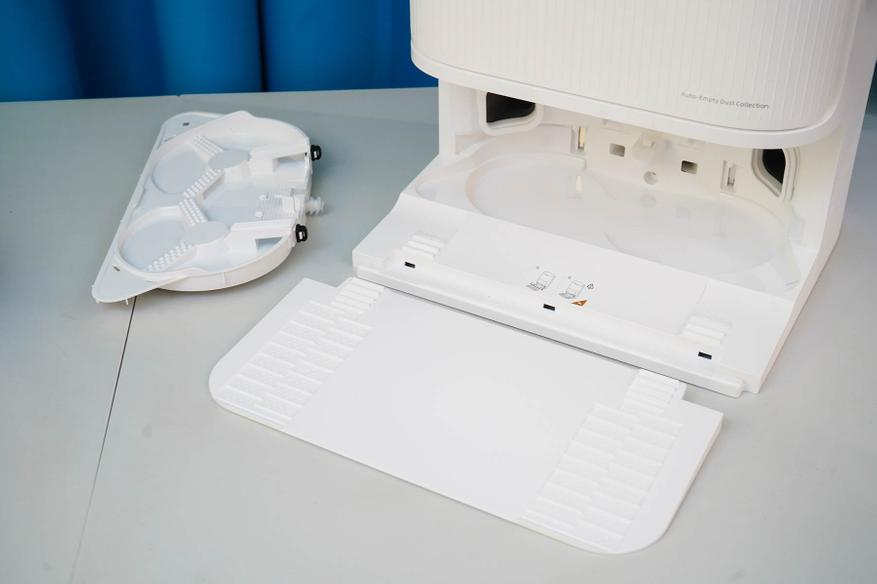 - Съемный контейнер для грязной воды. При мытье салфеток образуются отходы (грязная вода с мусором), которую станция откачивает из поддона и помещает в темный контейнер, расположенный в слева в верхней ниже корпуса под крышкой. Контейнер легко извлечь и опустошить (не забывайте споласкивать), оснащается датчиком уровня и имеет герметичную крышку.