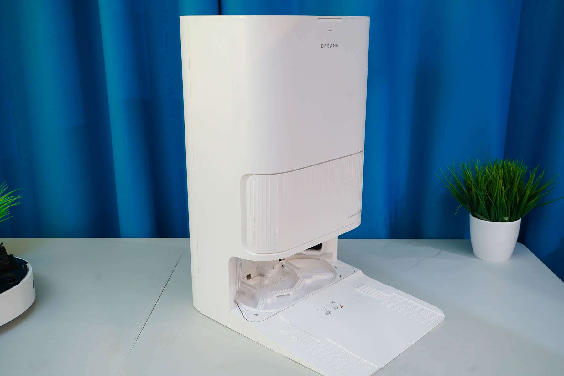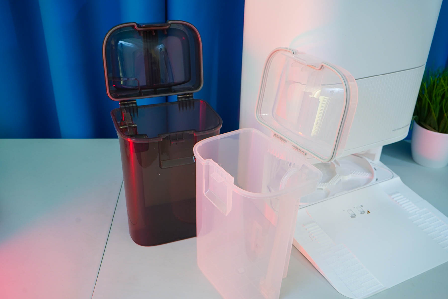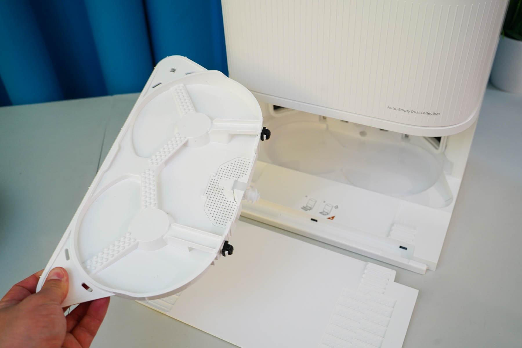 Такие размеры делают станцию не просто доком для парковки, а полноценной стационарной бытовой техникой, как кофемашина или микроволновая печь. Это важно учитывать при планировании места установки — потребуется свободный участок стены шириной и глубиной около полуметра. Спереди расположена ниша для парковки робота, а под откидной верхней крышкой скрываются два прозрачных резервуара объемом по 4 литра каждый (для чистой и грязной воды) и отсек для пылесборника. На внутренней поверхности крышки нанесена интуитивно понятная схема-инструкция по установке контейнеров.