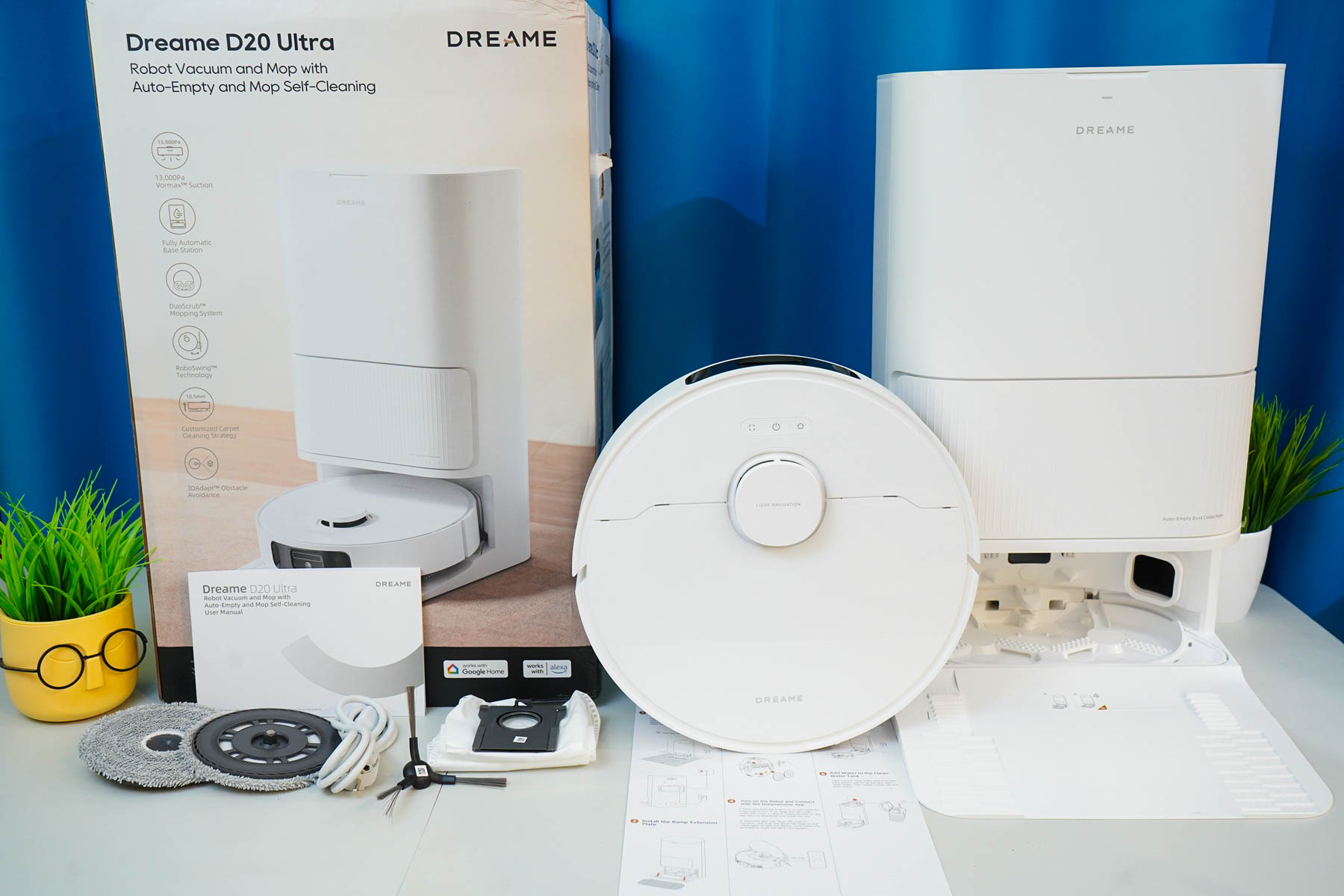 Собственно говоря, основная причина, из-за чего я выбрал модель D20 Ultra от Dreame — это его доступность при высокой автономности. Изначально хотел модель попроще — Dreame F10 Plus, тоже со станцией, но подкупили вместительные ёмкости для воды в D20 Ultra. Плюс подобной системы со станцией автоматической очистки — робот не будет требовать обслуживания после каждой уборки. А это — определенный выигрыш по времени для пользователя, свобода для личных дел. В комплектации производитель предусмотрел все необходимое для длительной эксплуатации: салфетки, боковую щеточку, запасной мешок для мусора. Есть и руководство (инструкция на русском языке присутствует.