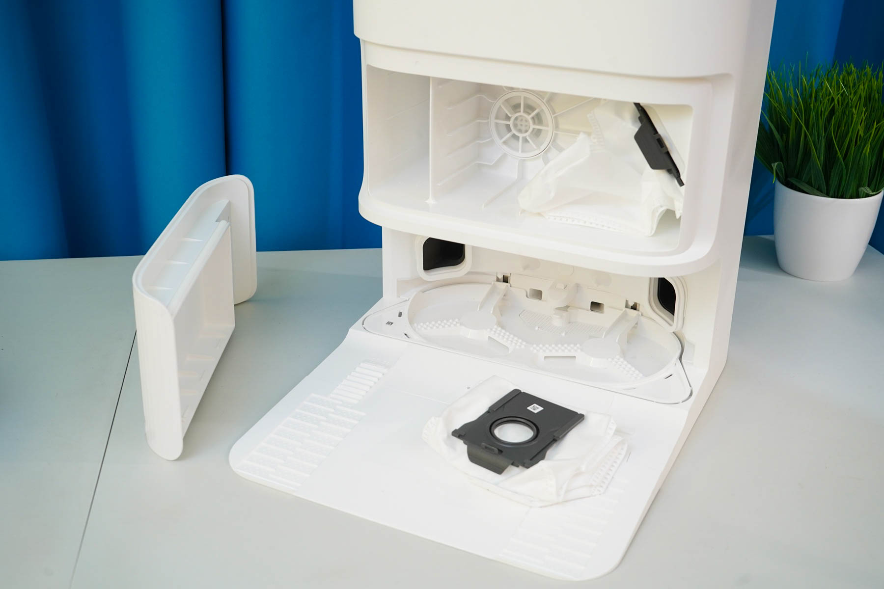 - Мешок для сбора мусора и пыли. Располагается под передней белой панелью. Панель легко отщелкивается, а сам мешок — заменяется. Часто менять не требуется — я смотрю на ресурс в приложении (проценты использования) или по факту наполнения. Один сменный мешок есть в комплекте, а вообще они имеются в свободной продаже.