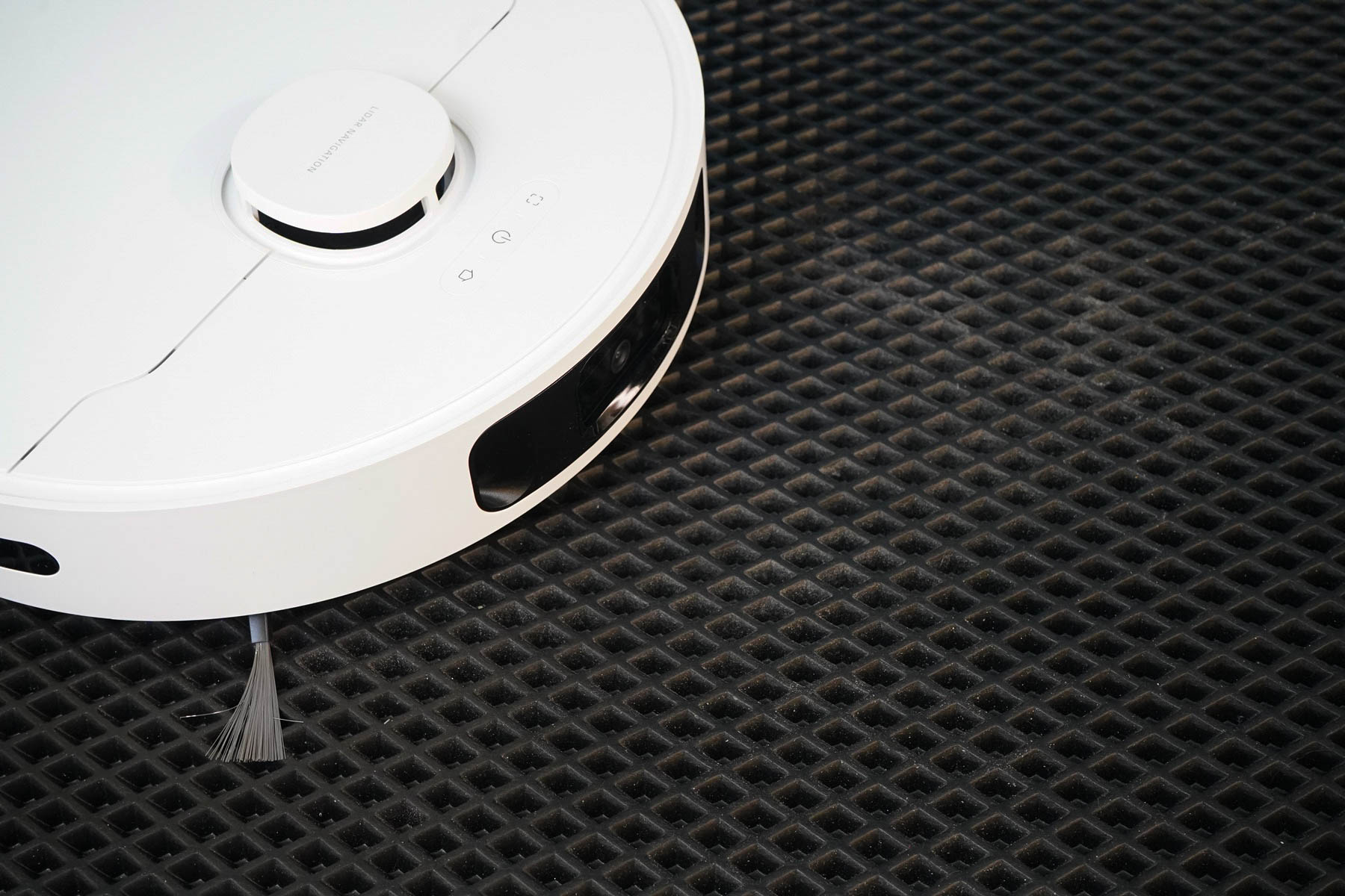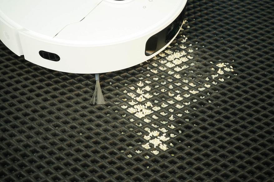 Кстати, мощности всасывания действительно хватает, чтобы собрать весь мусор из углублений — проверил на специальном коврике. Учитывая, что толщина в пару сантиметров этого коврика не составляет препятствия для робота, то его вполне можно запускать для уборки по всей площади квартиры, включая и входную зону, и коврик для кормушки питомца.