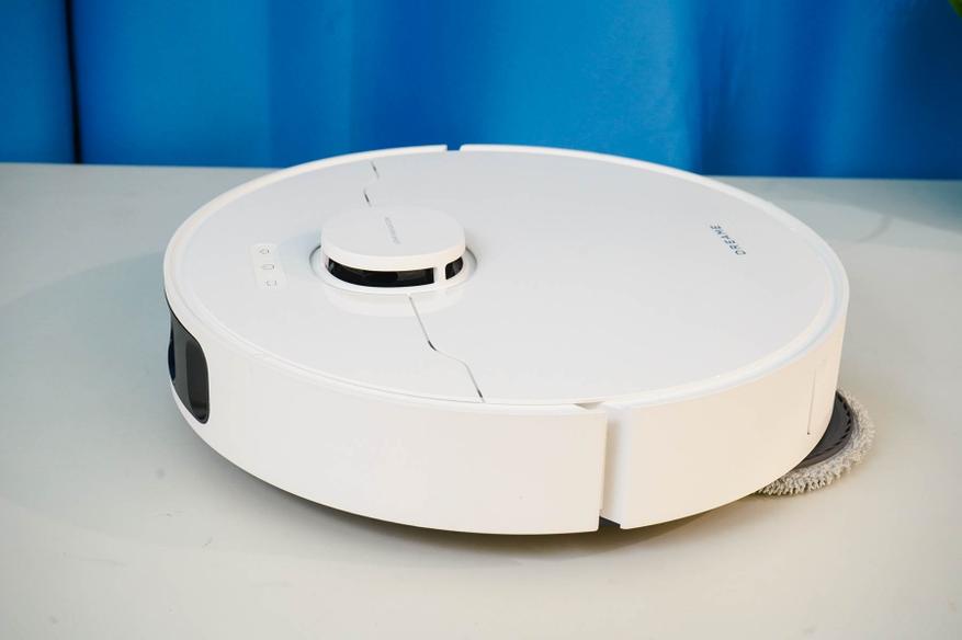 Сам пылесос имеет классическую круглую форму с характерной башенкой лазерного дальномера (LiDAR) в верхней передней трети корпуса. Габариты робота вполне позволяют маневрировать под мебелью: робот спокойно помещается между ножками кухонного стула в моем случае. На задней части корпуса имеется панель с контактами, клапан для мусора, а также заливное отверстие для воды — робот заправляется на станции перед уборкой.