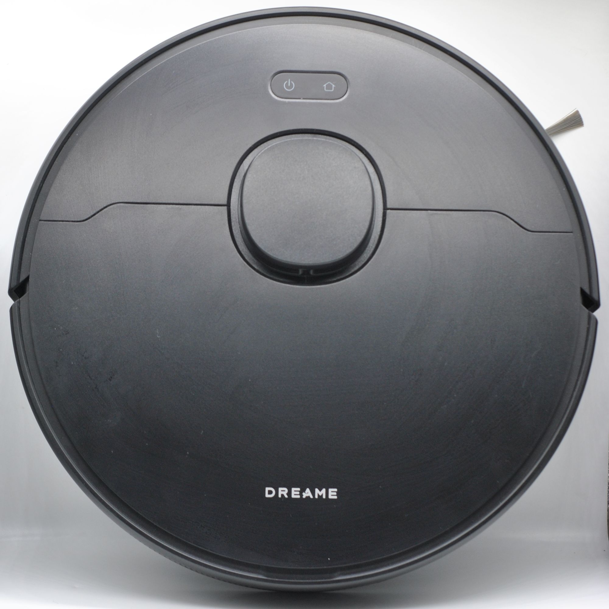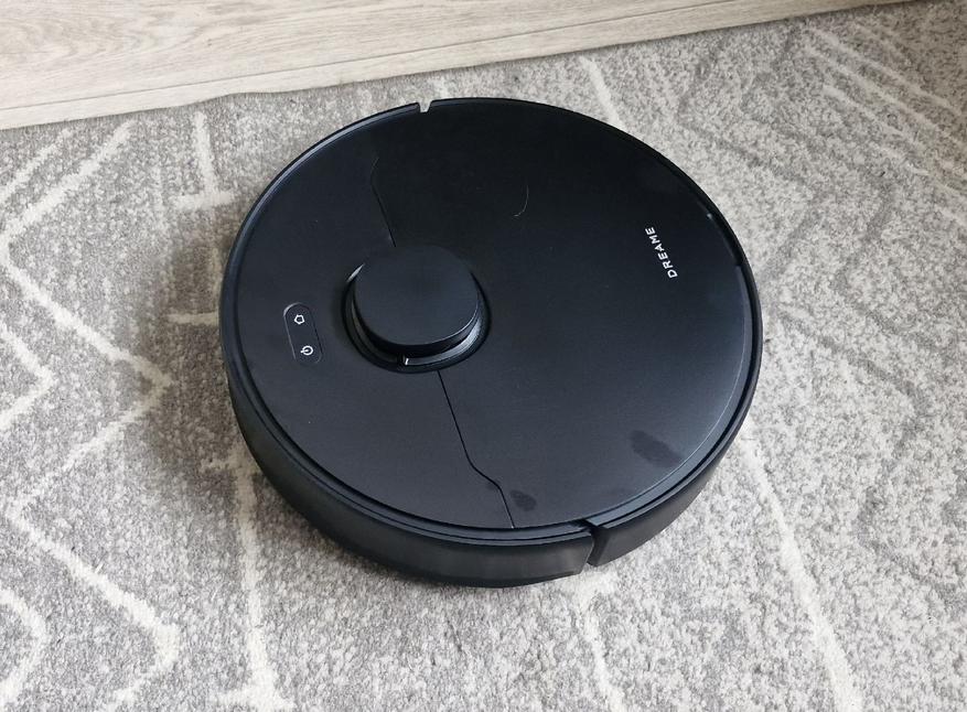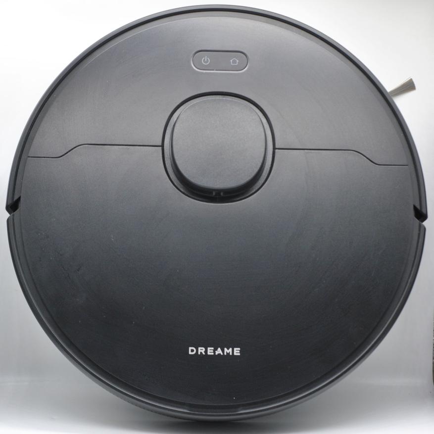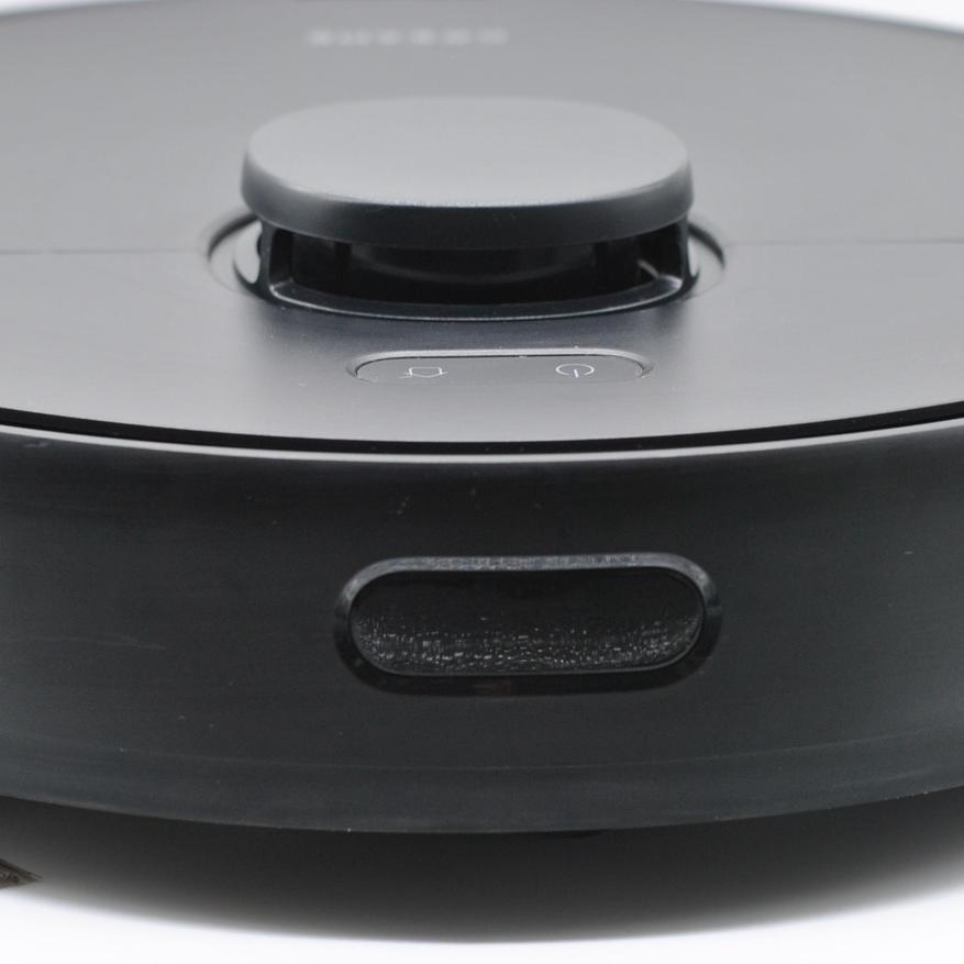 Внешний вид Dreame F10 привычный, форма цилиндрическая (35х8 см), сверху еще выступающая башня лидара (+2 см высоты). Сборка качественная, матовый пластик не так пачкается, кнопки с подсветкой. Спереди подпружиненный бампер (а не камеры машинного зрения), поэтому мелкие предметы перед уборкой лучше собрать с пола. Колеса 7 см, легко преодолевают 2-3 см перепады на полу.