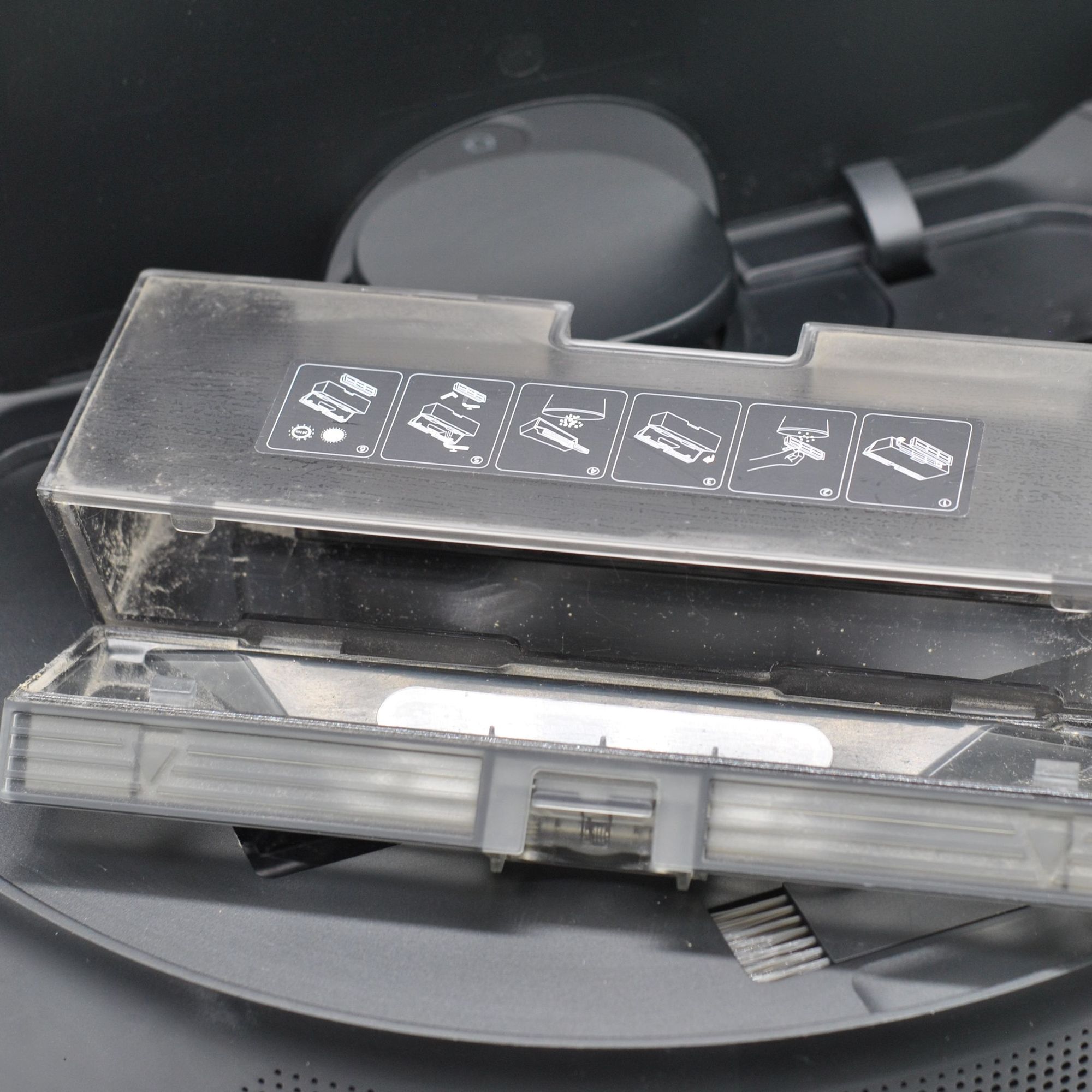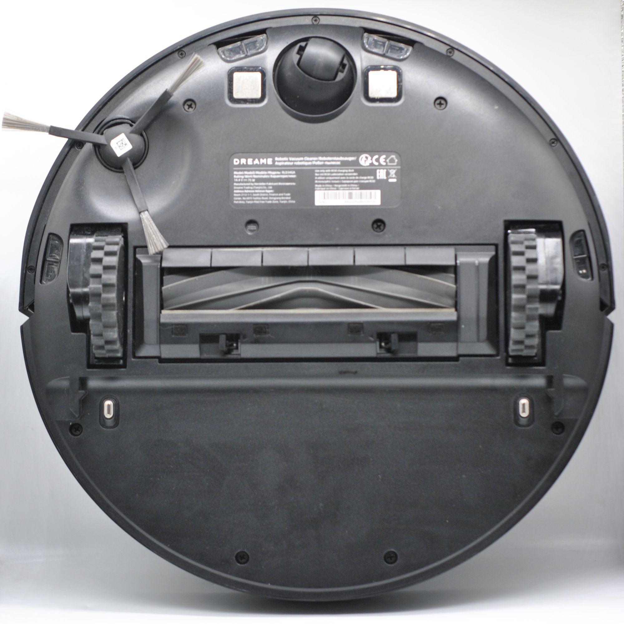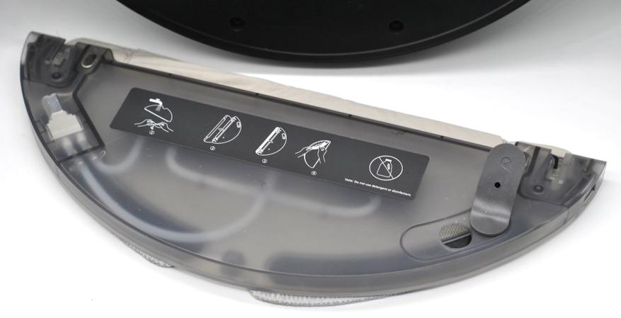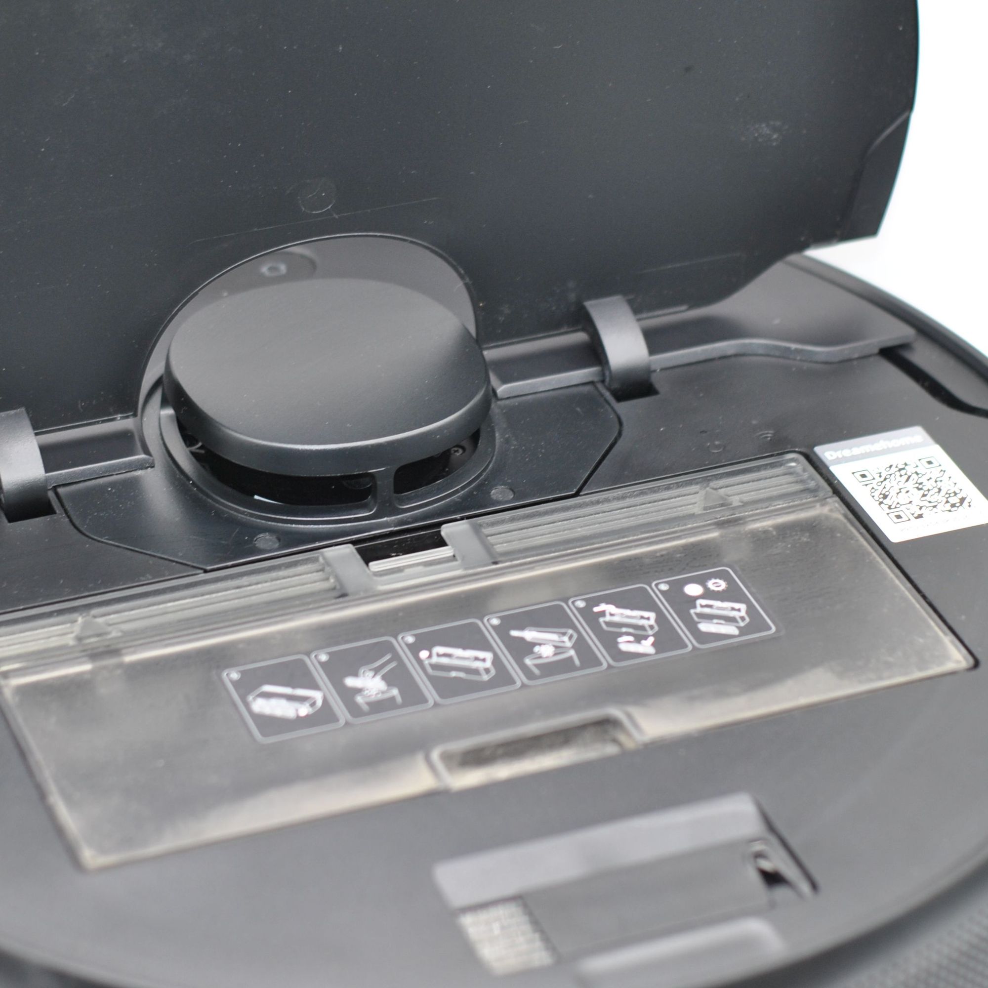 Пылесборник размещается под крышкой сверху, там же инструмент для очистки щеток и код для первоначально привязки к сети Wi-Fi: