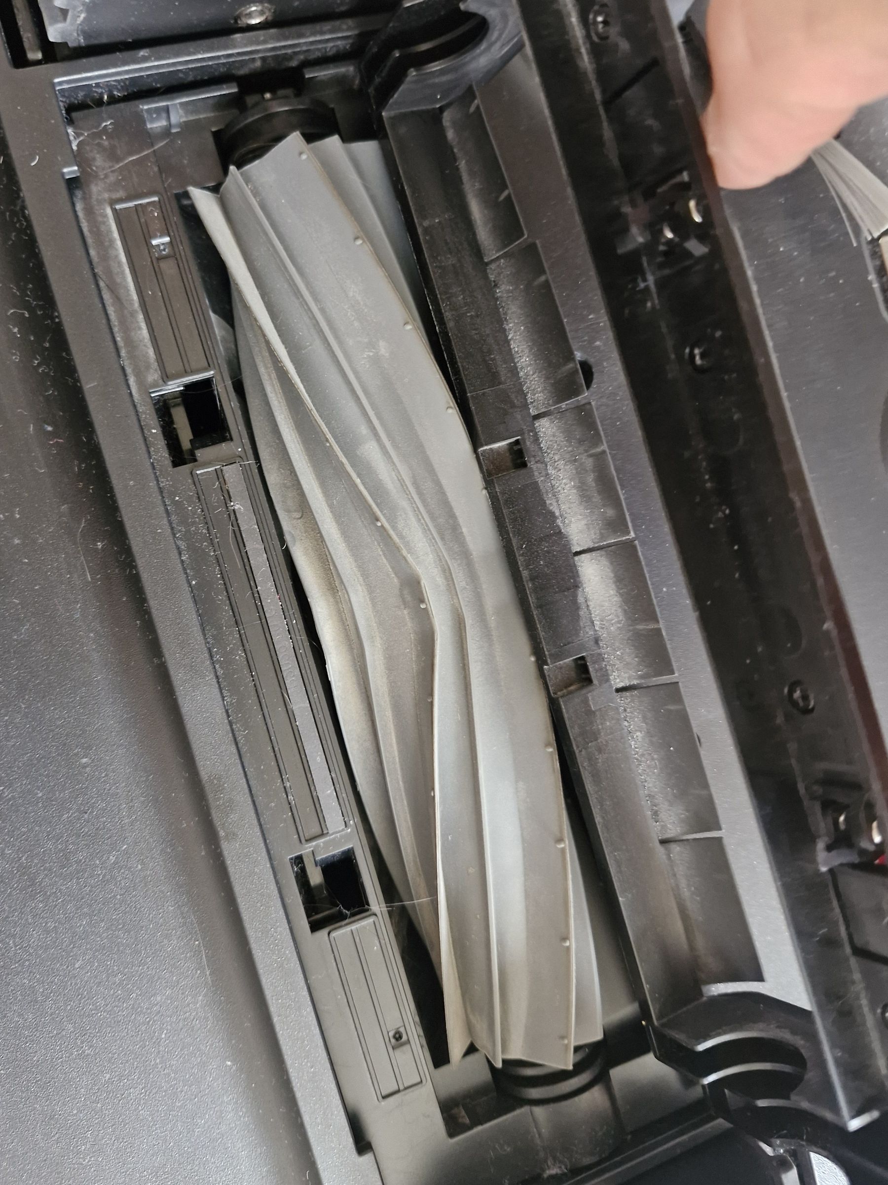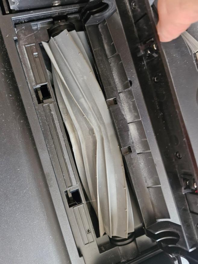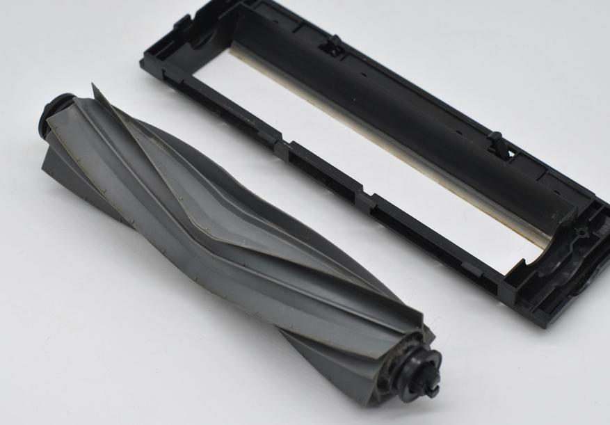 Щетка тут без ворса, а только с упругими силиконовыми пластинками (там меньше наматывается шерсти и волос — проверено), но главное весь блок подпружинен и плотно прилегает к поверхности пола. На коврах такая щетка как бы выбивает мелкую пыль из ворса.