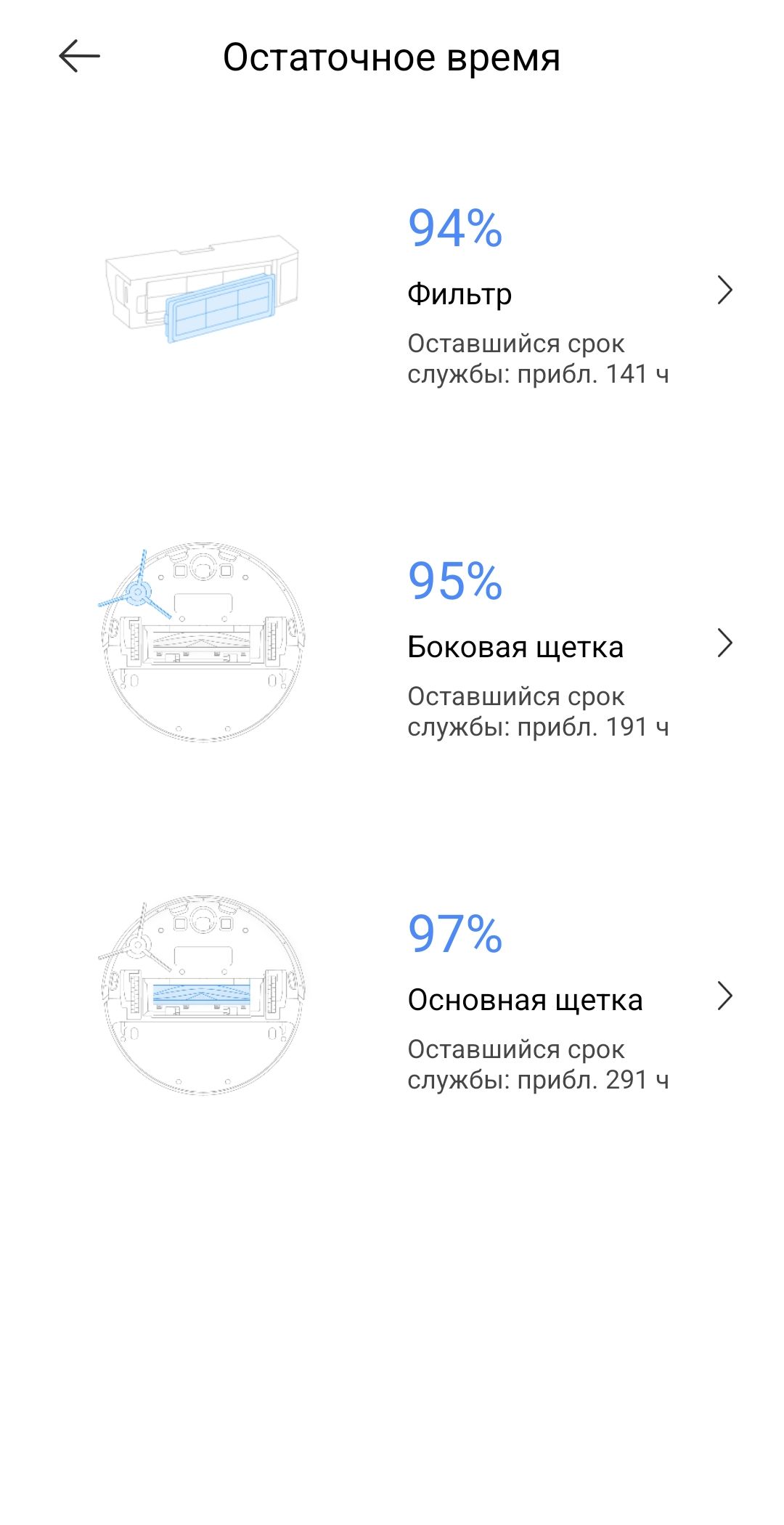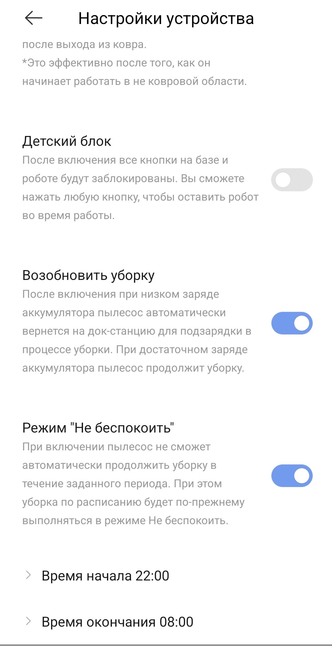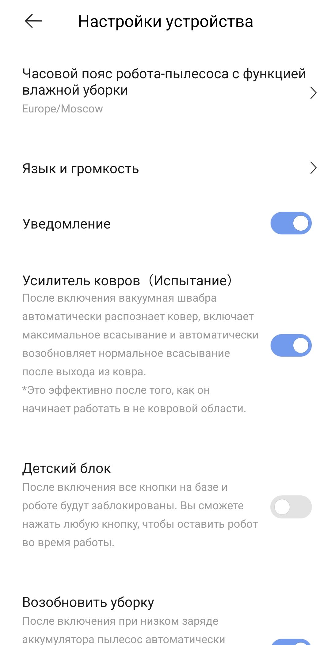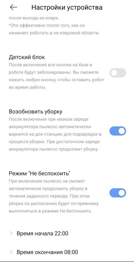 Еще возможности: первоначальное обучение, пульт управление, ресурс расходных материалов, настройка громкости и языка голосовых оповещений, голосового управления, усиленная уборка ковров, детский блок кнопок и пр.