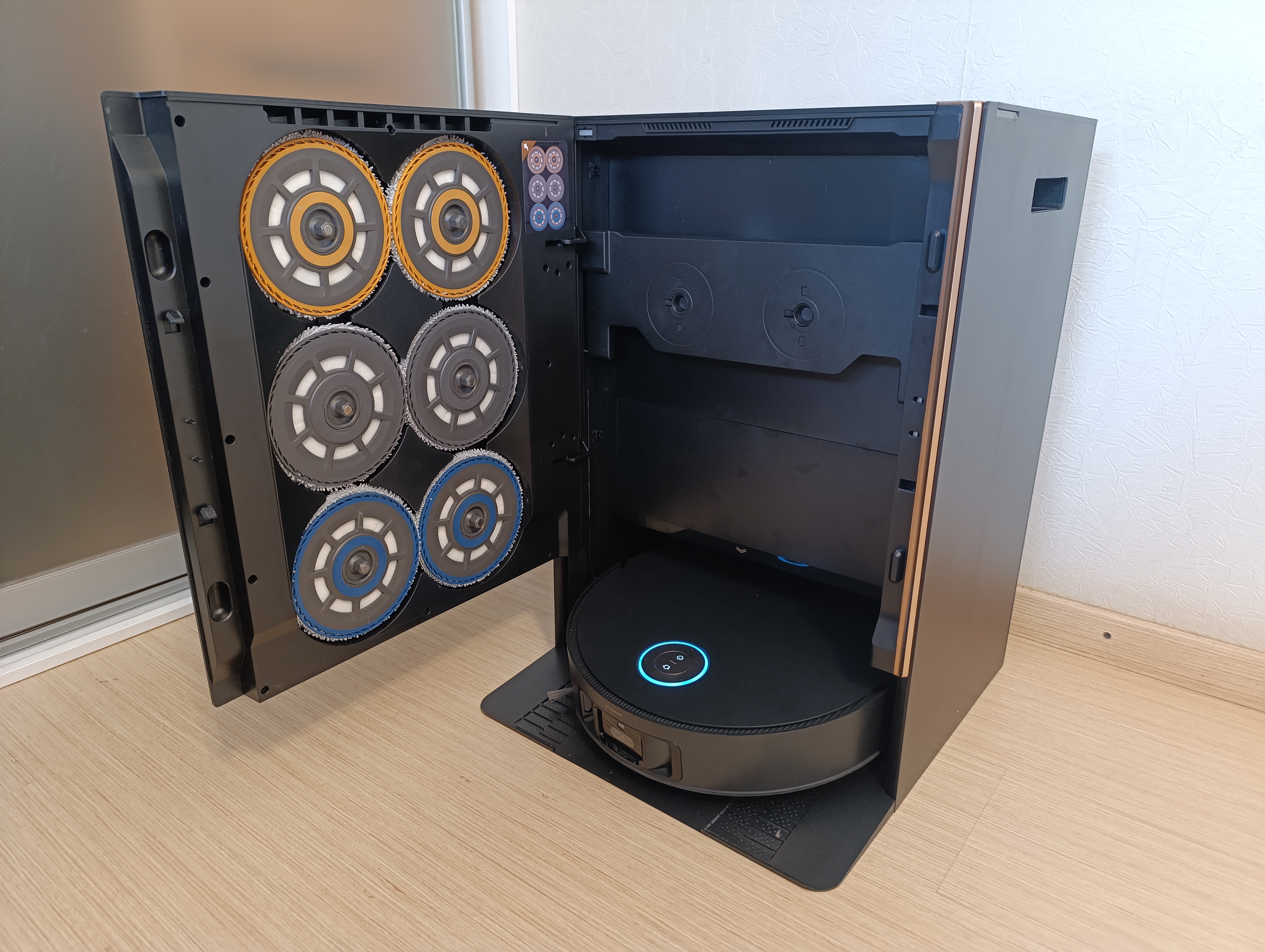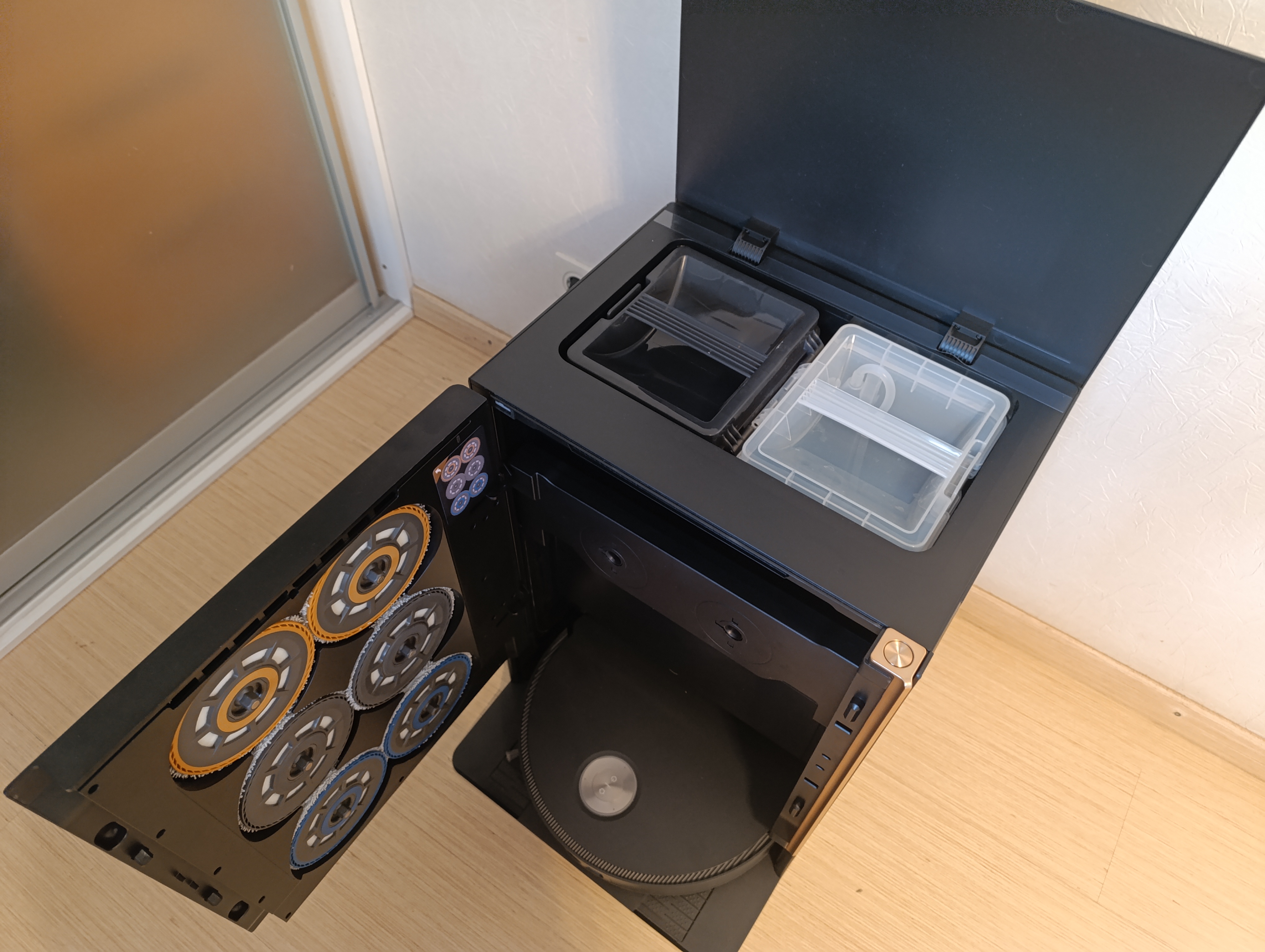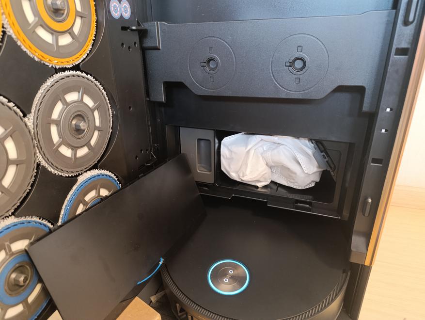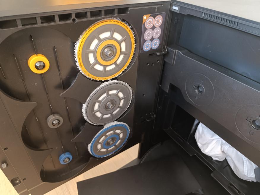 Держатели с установленными моющими насадками размещаются в маркированных цветом слотах в дверце док-станции и удерживаются на магнитах. Лифт подцепляет соответствующую пару и опускает ее в поддон, откуда ее уже забирает сам робот-пылесос.