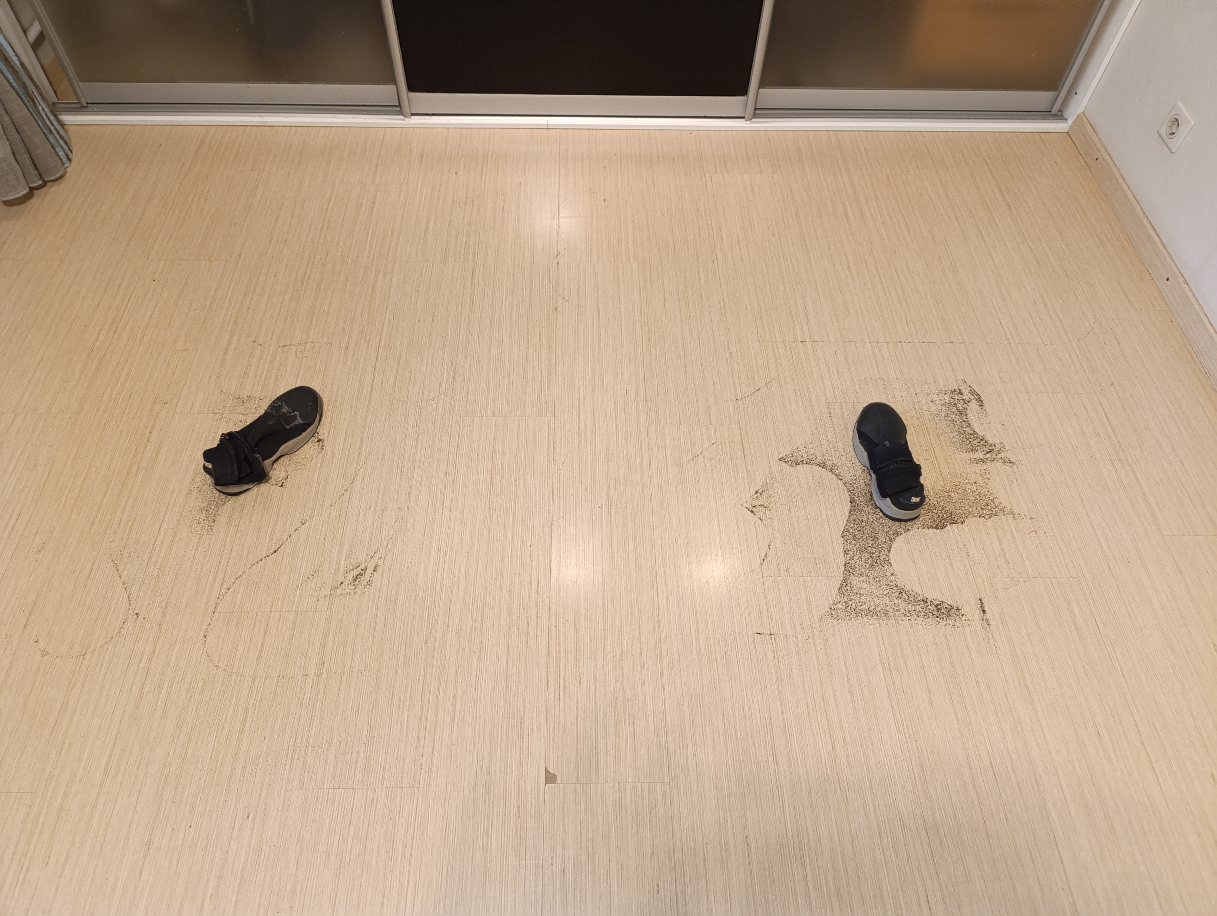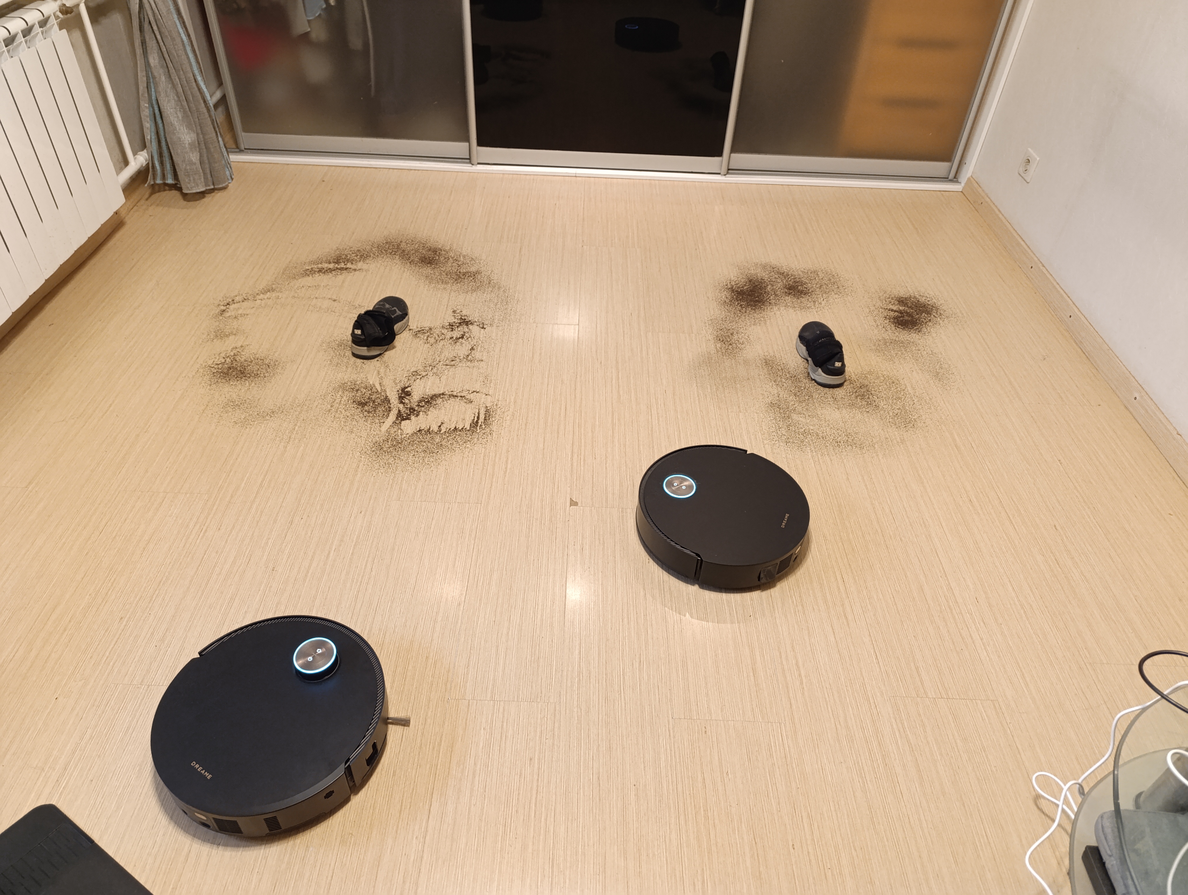 На пол был было высыпаны две равные горсти очень мелкого чая. В центре загрязнений — выставлены 2 одинаковых ботинка. В приложении были настроены две зоны уборки. на обоих пылесосах было выставлено: