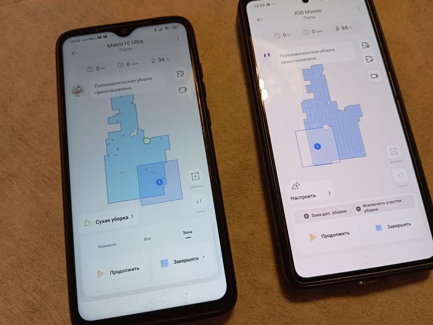 Во время работы Matrix двигался с одинаковой скоростью и судя по всему распознавал зоны загрязнения. X50 — двигался более хаотично, но ботинок распознавал и его аккуратно обходил.