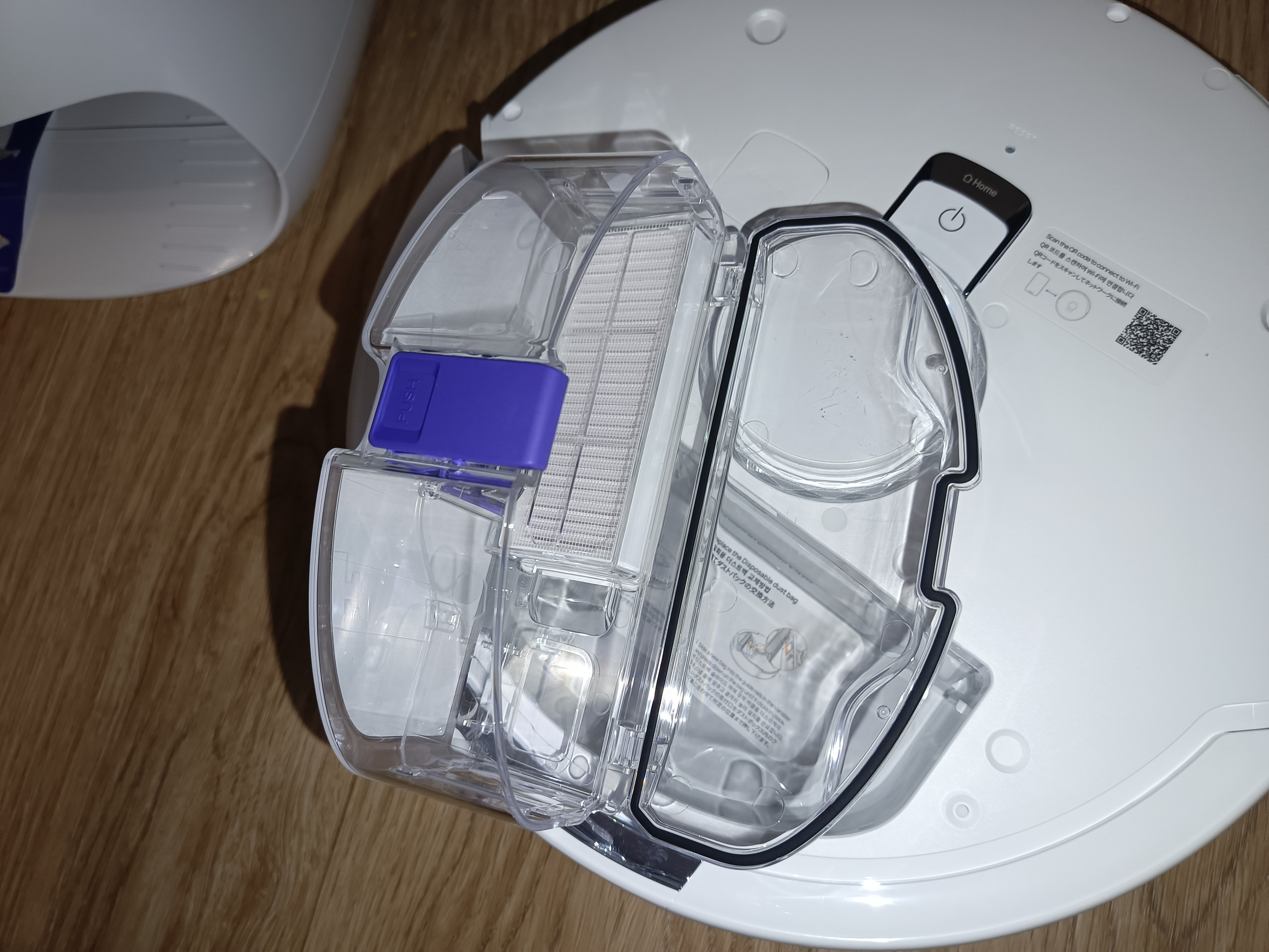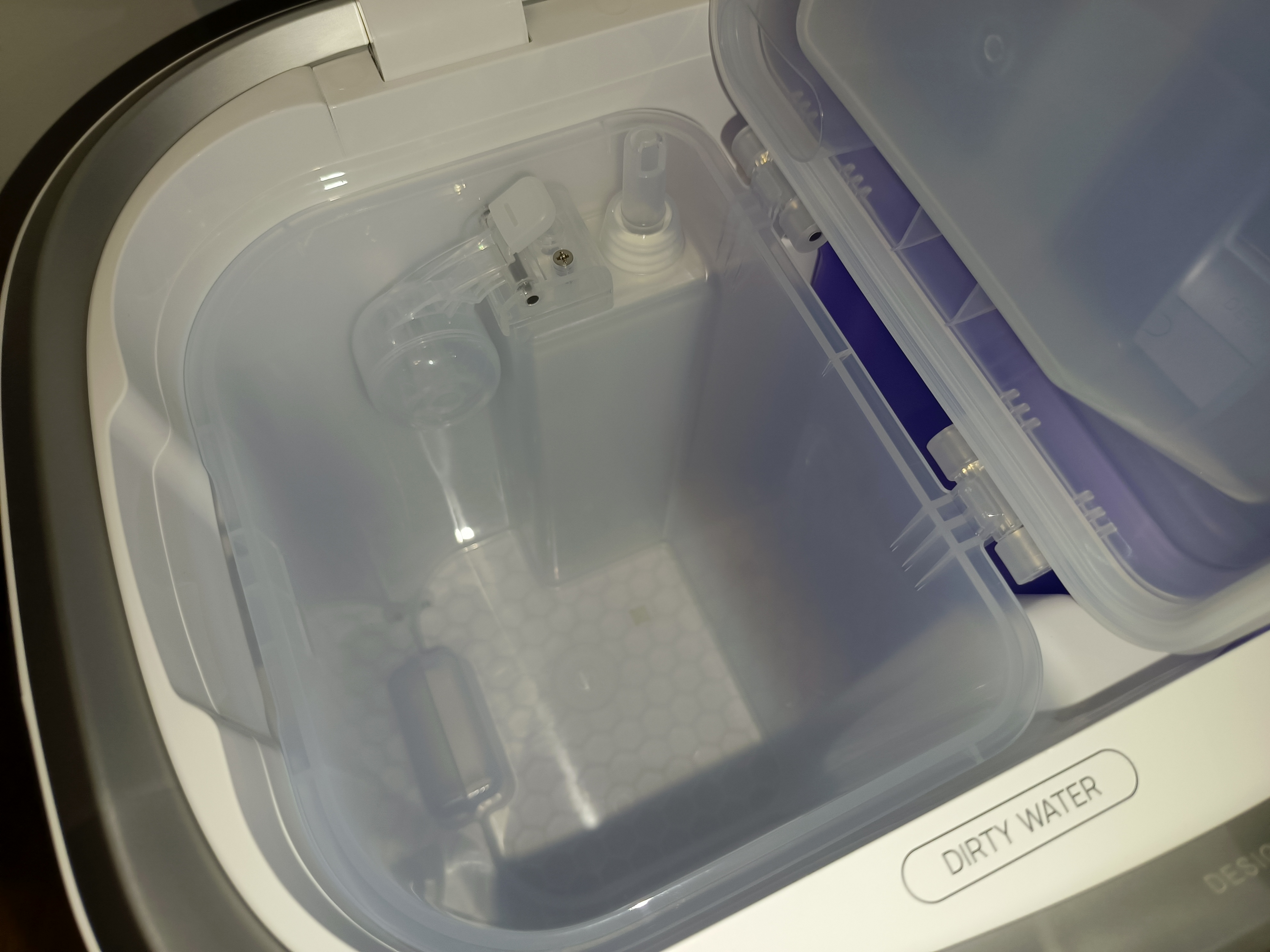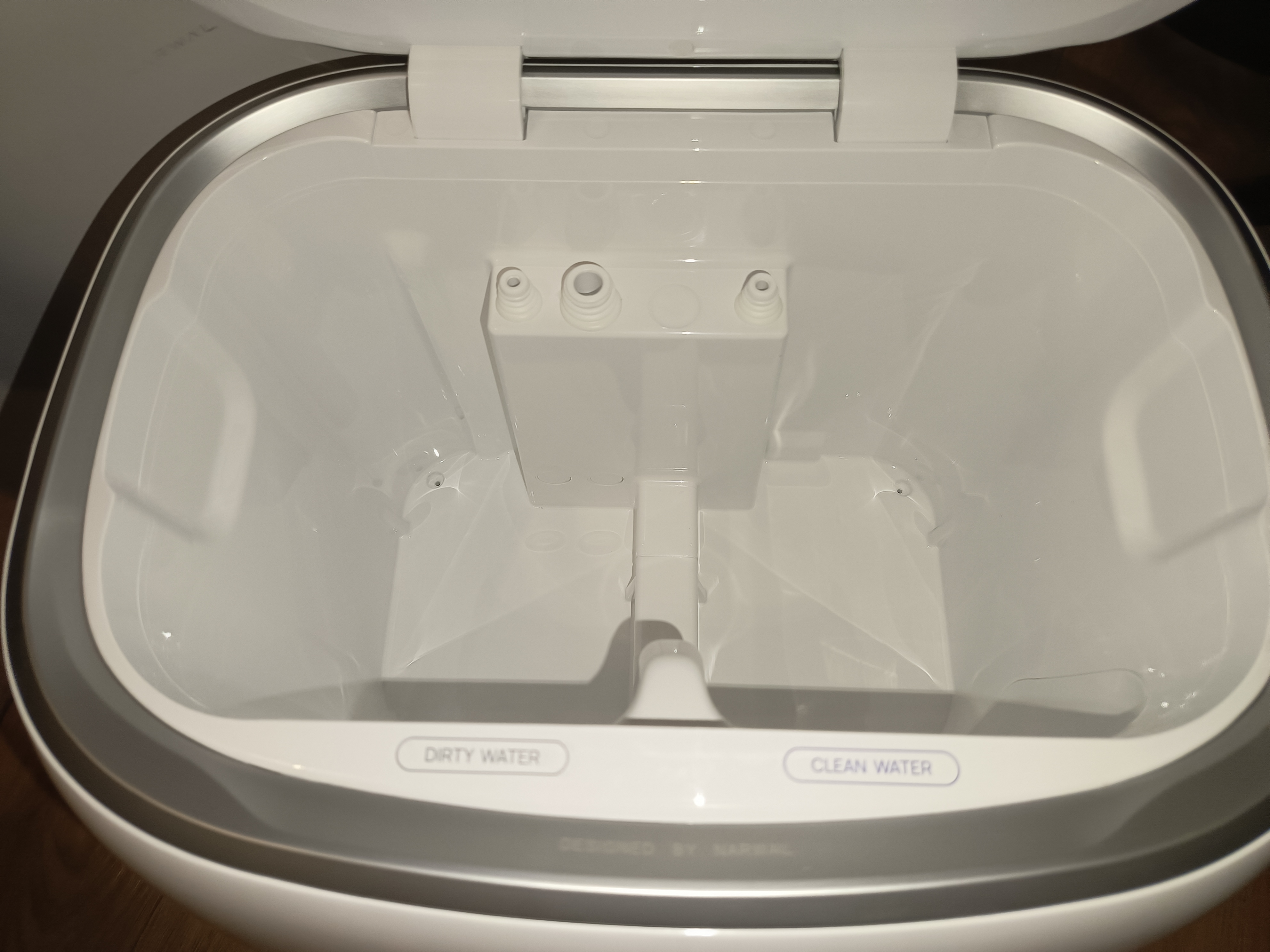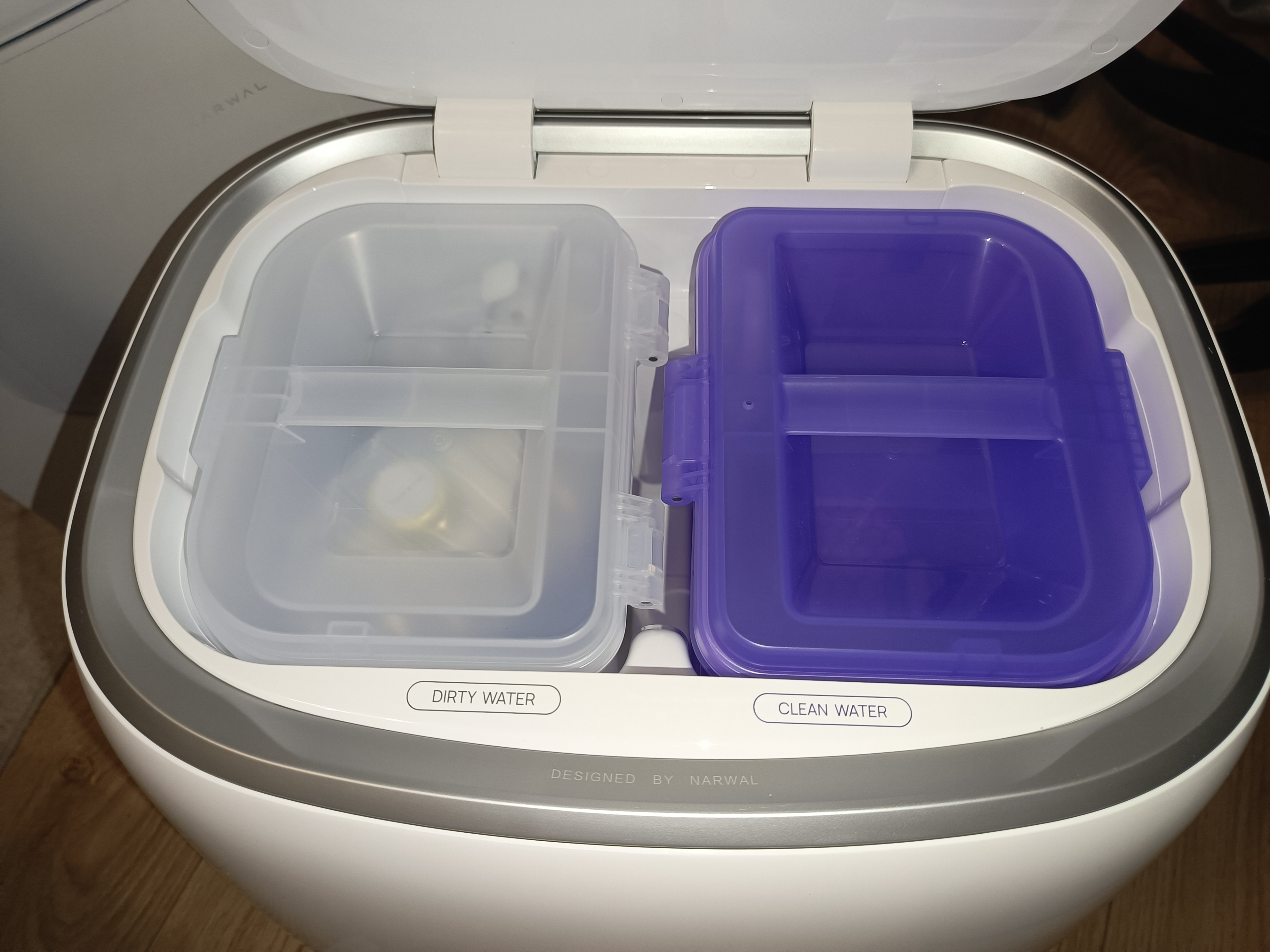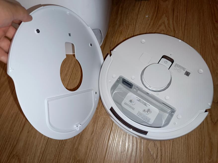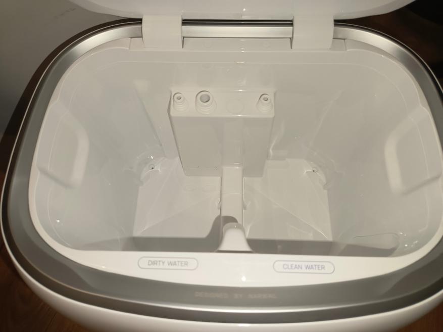 Внутри установлено два пластиковых контейнера, объем каждого — 4 литра. В синего цвета контейнер наливается чистая вода, а в белый будет выливаться грязная вода после мытья мопов. Контейнеры удобно обслуживать, за исключением одного: лучше его нести не за ручку сверху, а только придерживаться за нее, а держать из-под низу. Конструкция оснащена специальными пазами, поэтому перепутать контейнеры местами вы не сможете. Когда контейнер с грязной водой будет заполнен, вам придет уведомление на смартфон, а также сообщит об этом голосом.