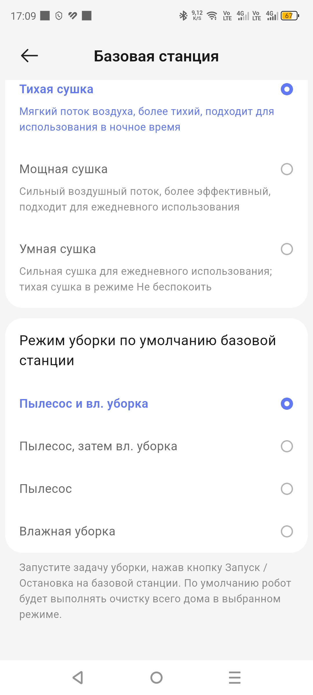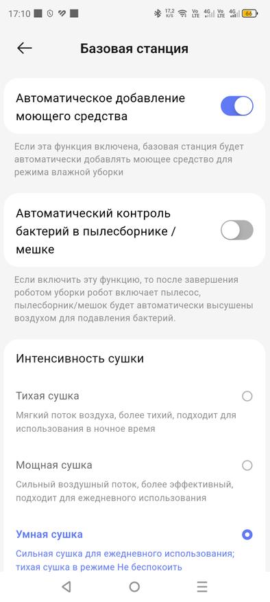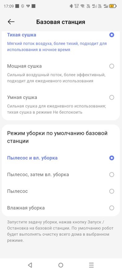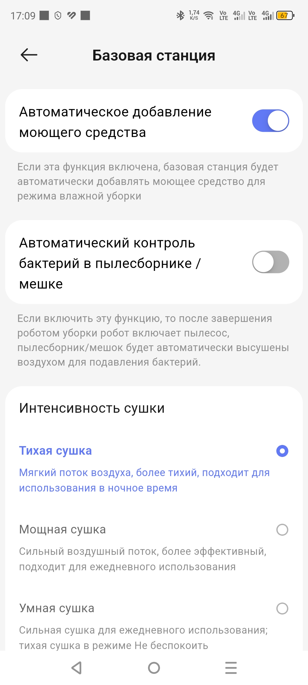 В станции установлена сушка, поэтому тряпки после использования вам не придется снимать, стирать вручную и тем более сушить. За вас всё делается автоматически. Сушка тряпок — приятный бонус, но он очень долгий. Этот режим включается в течение пяти часов. Принцип работы: тряпки обдуваются воздухом, и, следовательно, от этого стоит небольшой шум вентилятора. Если стоит возле кровати, то не столь приятно, особенно если вы засыпаете. Сушку можно не включать или выключить в любой момент.
