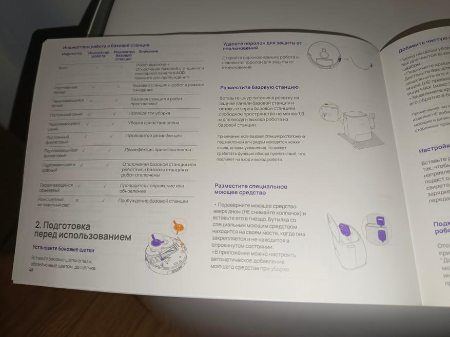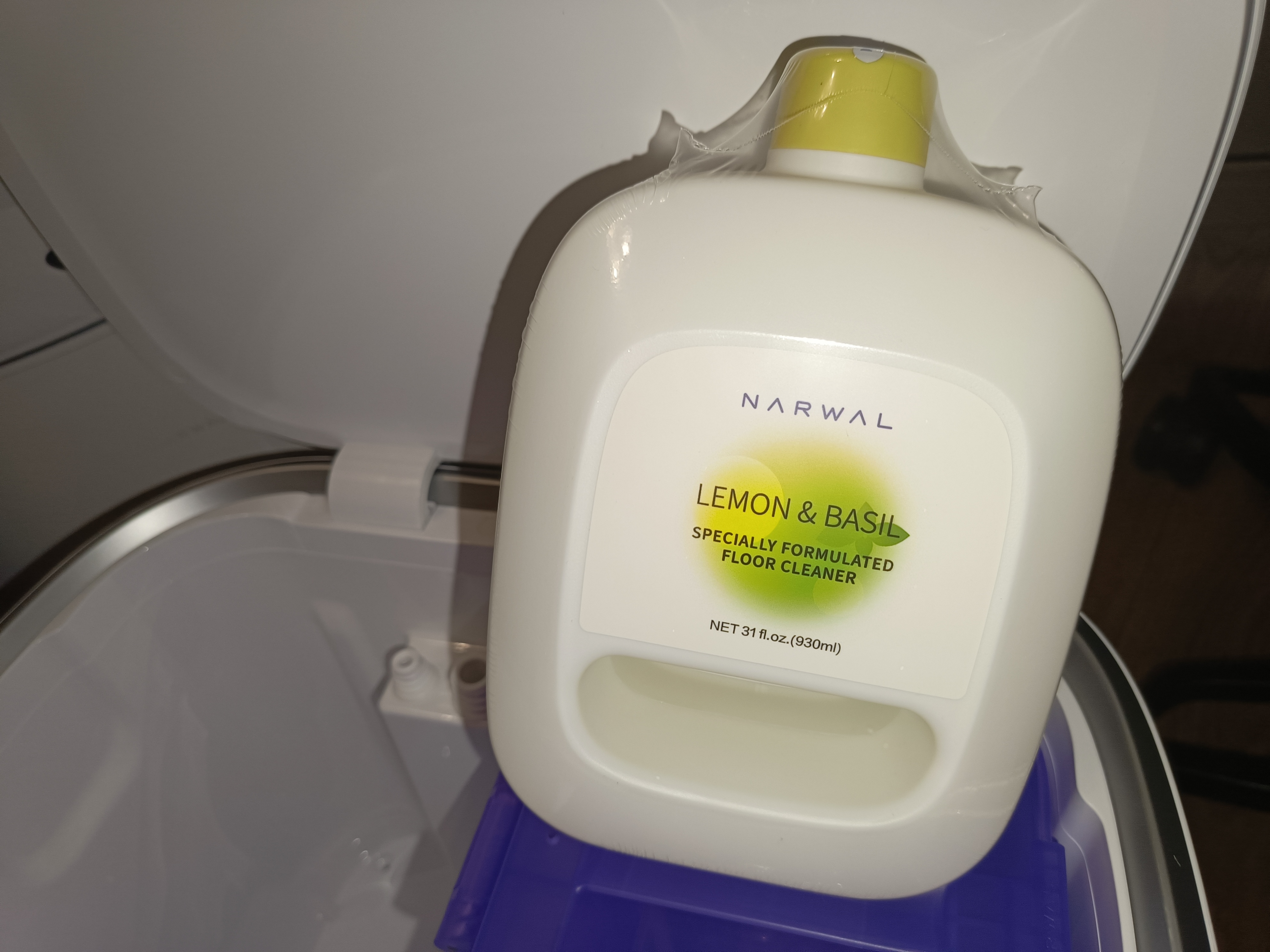 За контейнером устанавливается моющее средство, которое будет добавляться в воду автоматически при мытье полов. Включается данная функция в приложении. В комплекте идет одна бутылочка с лимонным запахом.