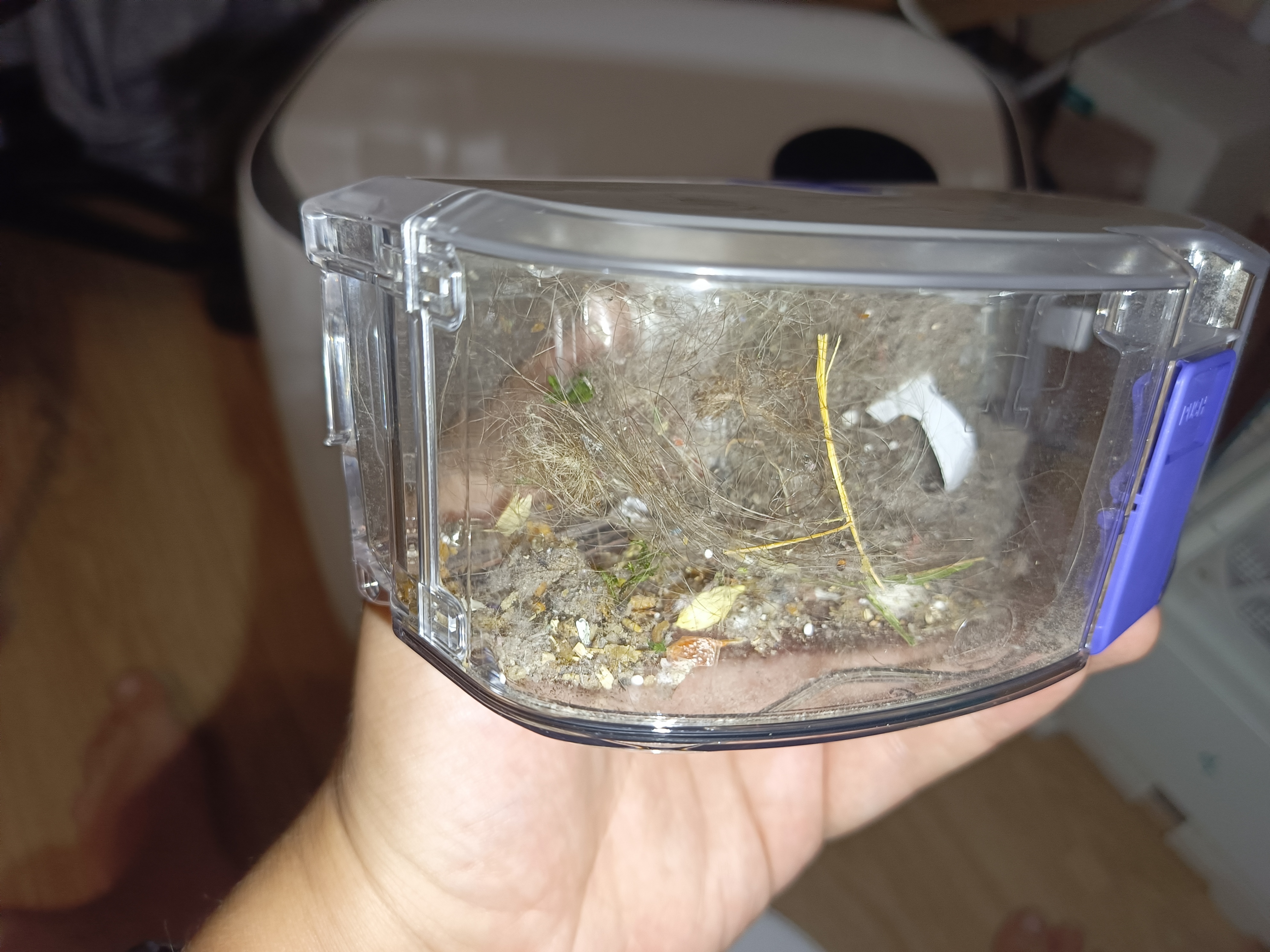 С приложением разобрались, теперь по поводу самой уборки. Сразу скажу, что пылесос убирает просто безупречно. Весь мусор, который даже невиден, он находит и собирает в контейнер. Система от наматывания волос на основную щетку работает, и, как вы видите, все волосы собраны в контейнере, а на самой щетке ни одной волосинки. Я как обладатель второго пылесоса с классической щеткой примерно каждые две уборки брал ножницы, доставал щетку и срезал их. Очень неудобно и непрактично. Теперь я забыл об этой проблеме.