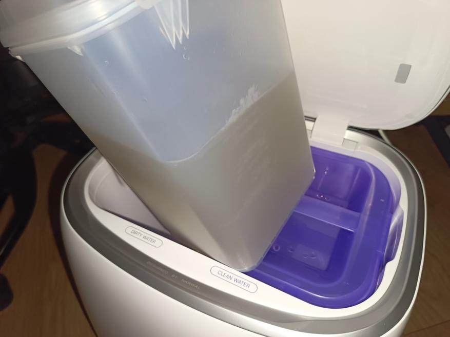 Пользуюсь пластиковым контейнером, а одноразовые отложил в сторону. Контейнер легко обслуживается, так как в нем нет сложных деталей, где будет забиваться мусор. Достаточно открыть крышку и высыпать в мусорное ведро. Его можно мыть под краном, так же как и установленный в него HEPA-фильтр. Контейнера мне хватило на месяц использования, где примерно раз в два дня я включал пылесос. Это, безусловно, плюс, так как я за месяц только доливал чистую воду и выливал грязную.