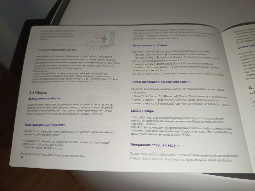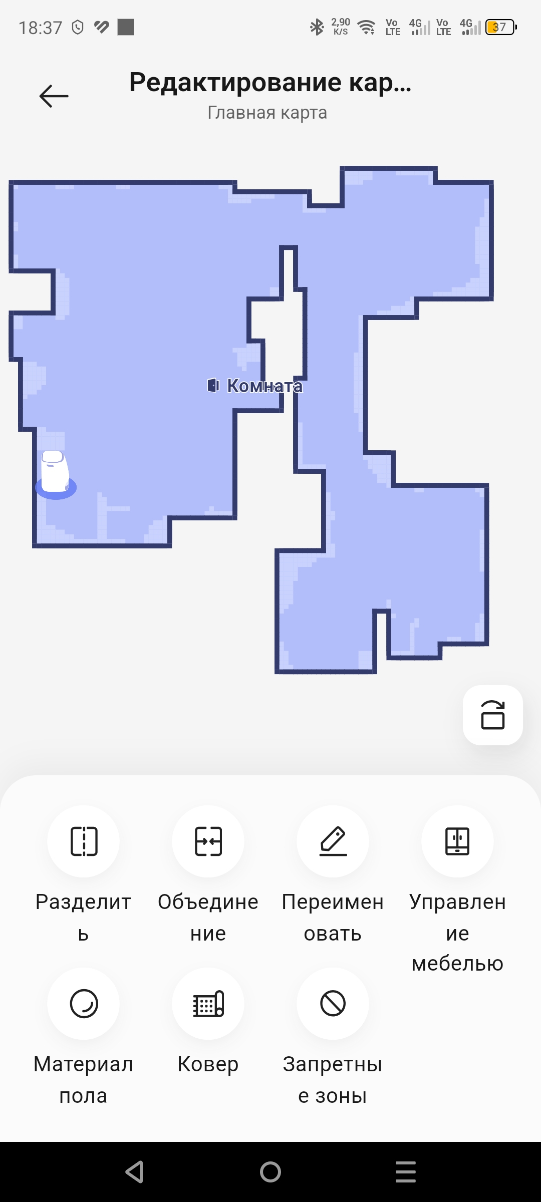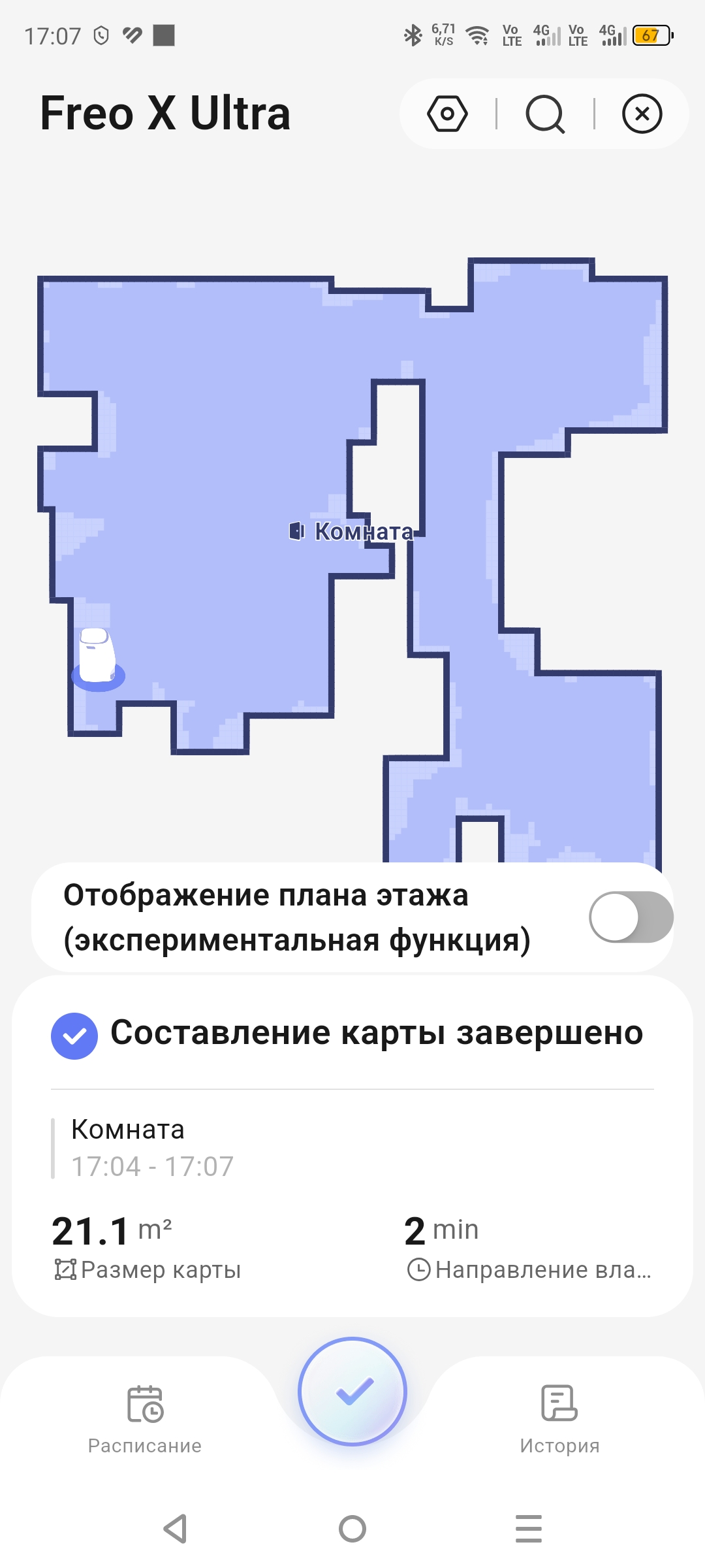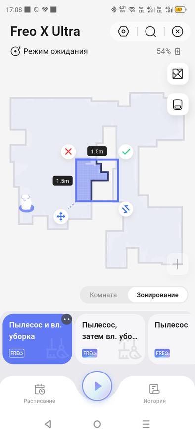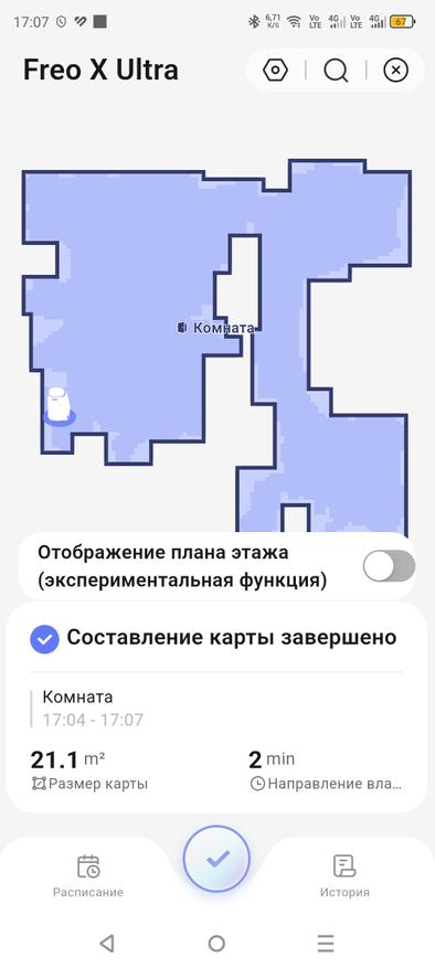 Карта рисуется весьма точно и безошибочно. Определяет ножки столов, стульев и аналогичные предметы, причем неважно, темные они или светлые. Навигация реализована весьма хорошо, но с одним, но. Умный алгоритм уборки мне не очень понравился, так как ему может показаться грязно там, где чисто, или наоборот, и процесс уборки может сильно затянуться. Можно запускать в обычном режиме, где вы сами выставляете количество проходов, мощность всасывания, интенсивность увлажнения тряпки и другие параметры, отвечающие за процесс уборки.