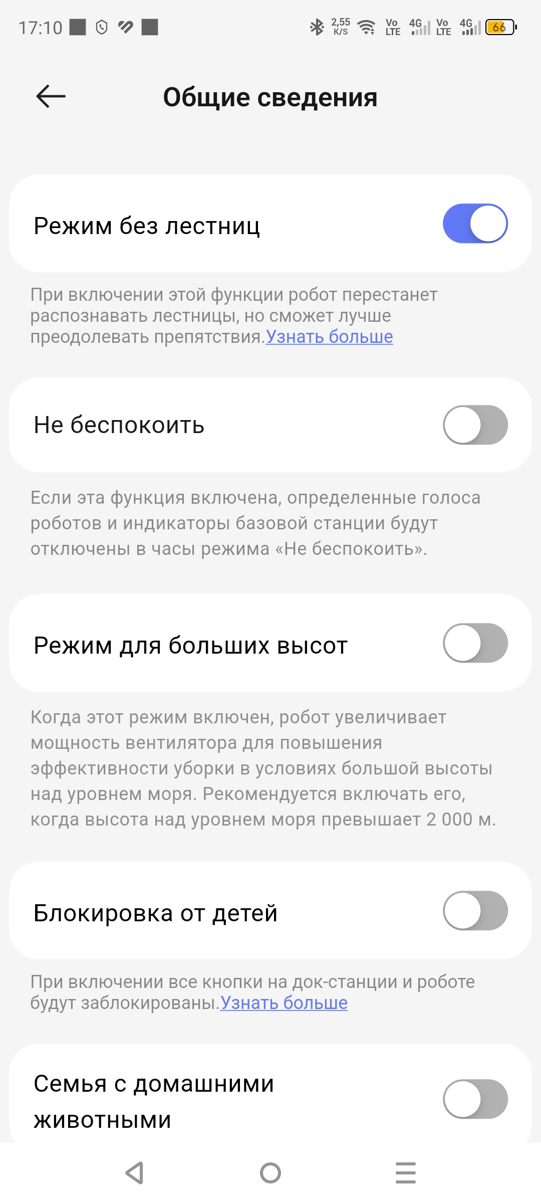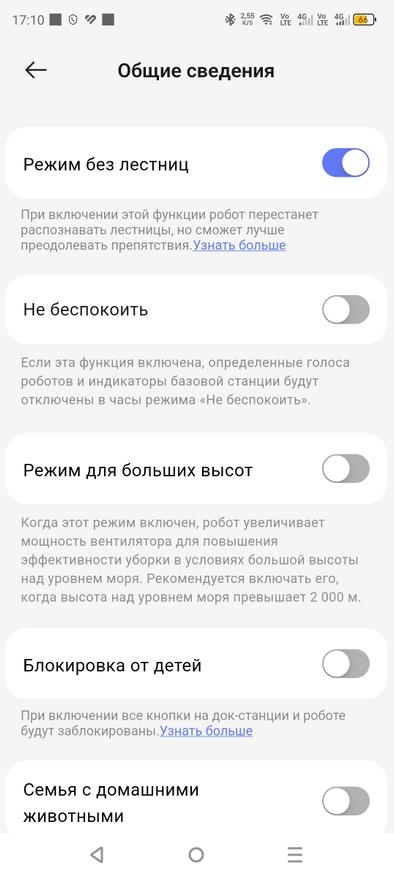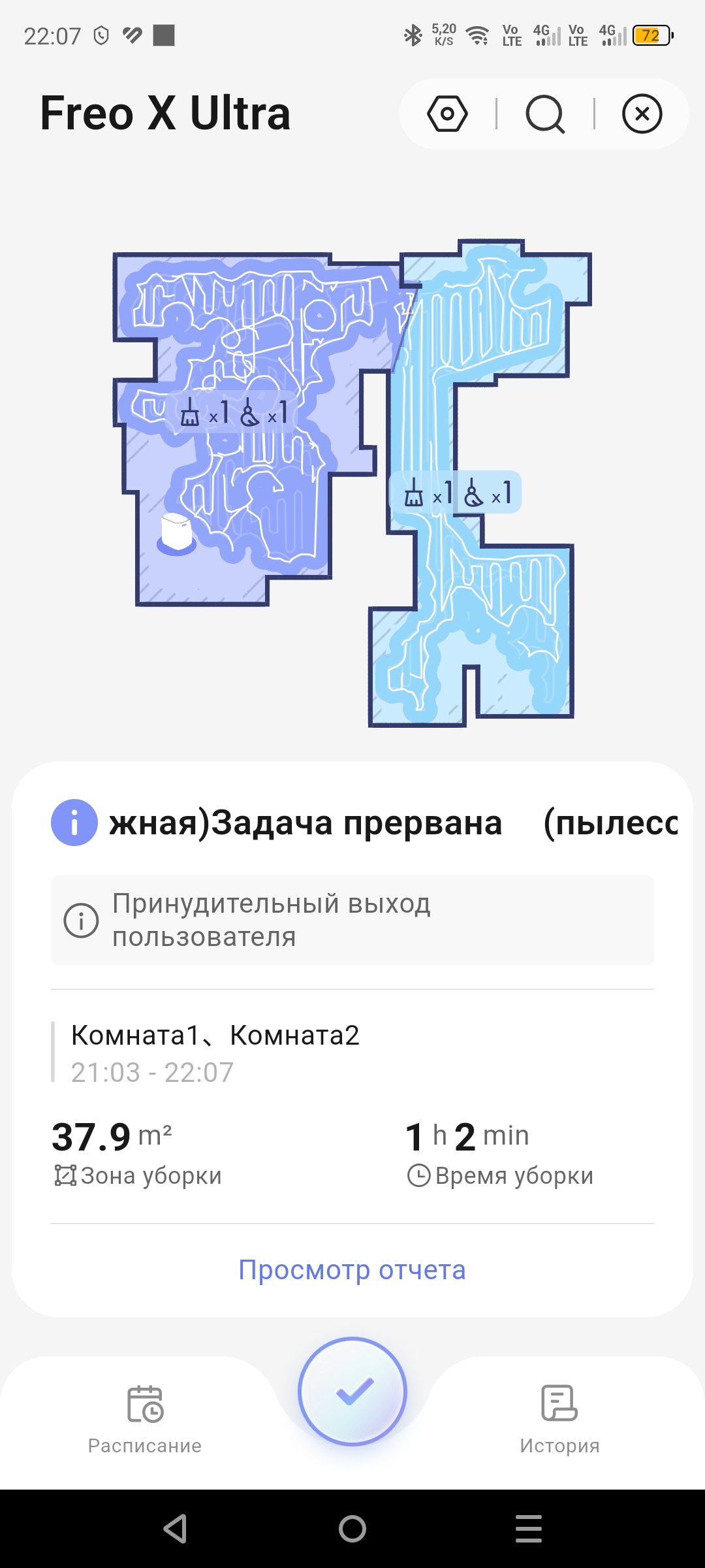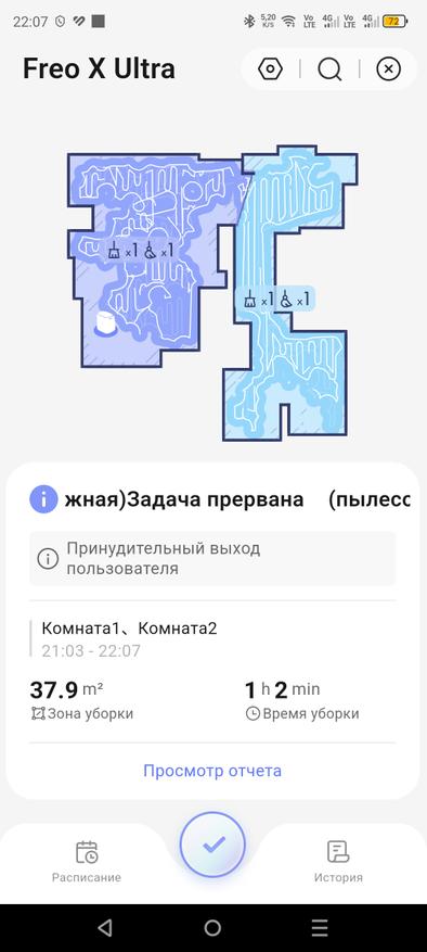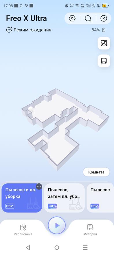 Карта рисуется весьма точно и безошибочно. Определяет ножки столов, стульев и аналогичные предметы, причем неважно, темные они или светлые. Навигация реализована весьма хорошо, но с одним, но. Умный алгоритм уборки мне не очень понравился, так как ему может показаться грязно там, где чисто, или наоборот, и процесс уборки может сильно затянуться. Можно запускать в обычном режиме, где вы сами выставляете количество проходов, мощность всасывания, интенсивность увлажнения тряпки и другие параметры, отвечающие за процесс уборки.