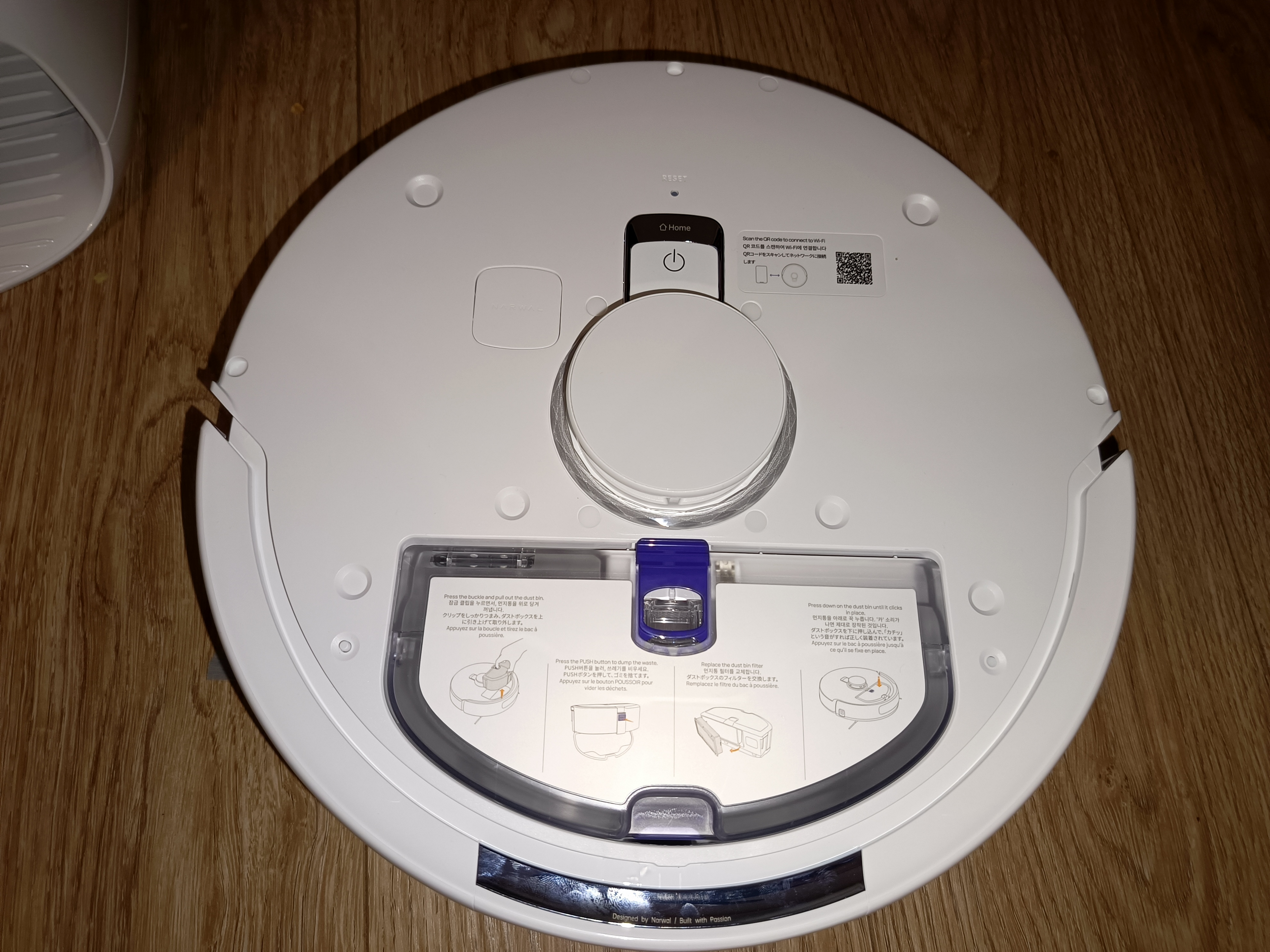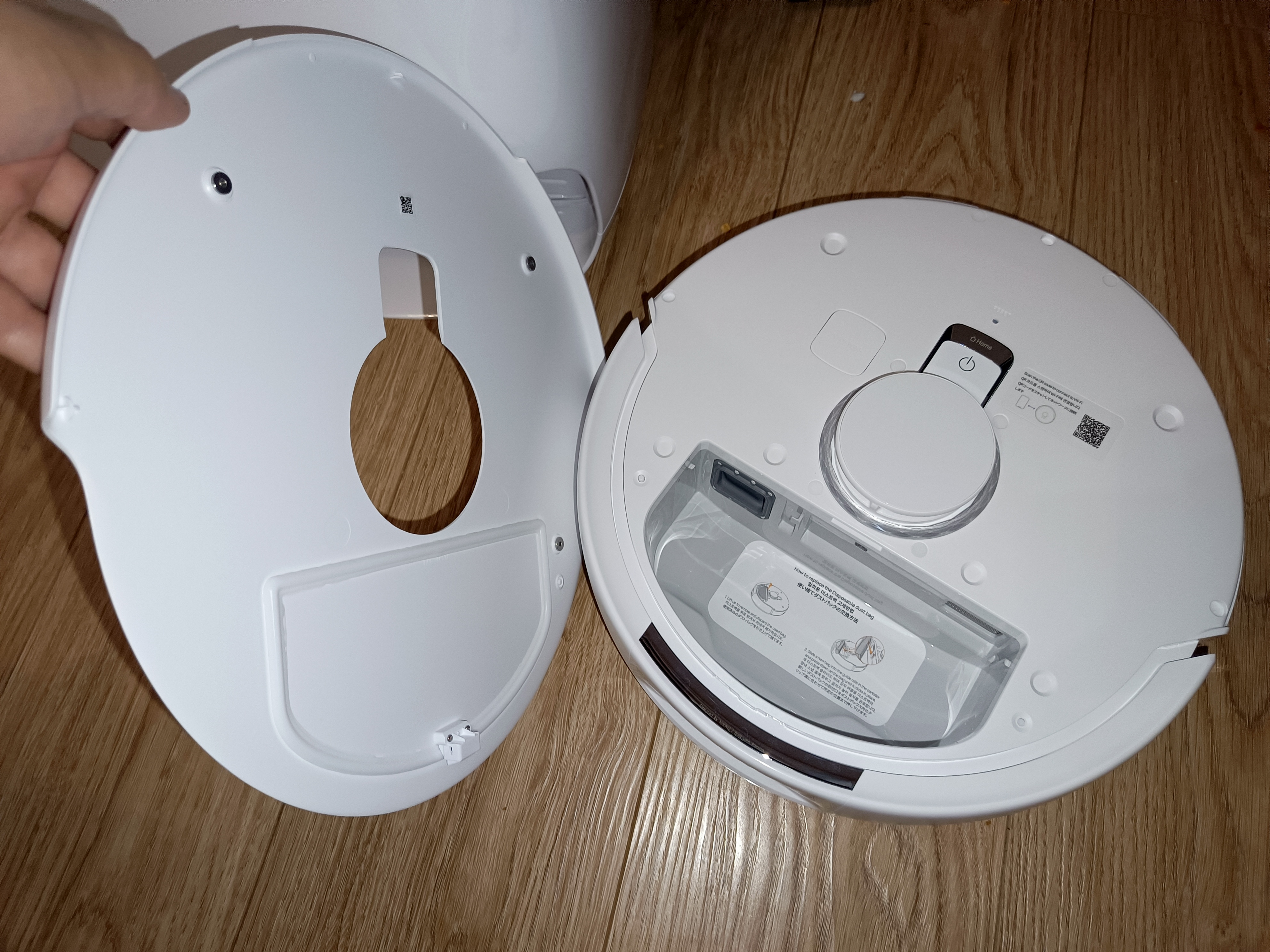 Основная станция выполнена в белом цвете, и это, безусловно, плюс, так как впишется в любой интерьер. Всё сделано лаконично и без излишеств. Верхняя крышка открывается под углом чуть больше 90 градусов и уверенно удерживается. На ней установлен небольшой сенсорный дисплей, который позволит запускать пылесос и возвращать его назад. Производитель продумал тот факт, что в доме могут быть маленькие дети, которые смогут нажимать на этот сенсор, поэтому в приложении есть блокировка всех кнопок, причем как на самом пылесосе, так и на зарядной станции.