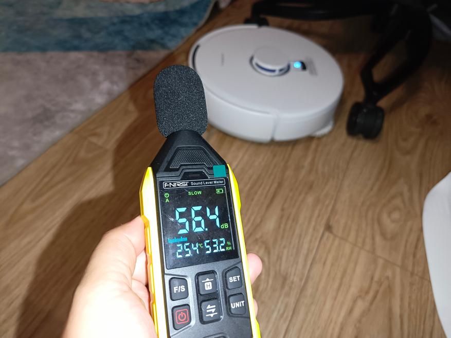 На максимальной мощности всасывания уровень шума составляет около 55-57 дБ, что соответствует заявленному значению производителя. Данный режим нужен больше, если у вас невысокие коврики, паласы, где для тщательной чистки требуется увеличить мощность всасывания. Обычно использую третий режим, и его полностью хватает для уборки с плитки и ламината. В минимальном режиме уровень шума снижается до 35 дБ, что является очень тихим значением, и можно запросто пылесосить в тот момент, даже когда вы спите. Конечно, использовать только в том случае, если у вас легкая загрязненность и вы хотите просто освежить помещение от пыли. При мытье полов робота также практически неслышно.
