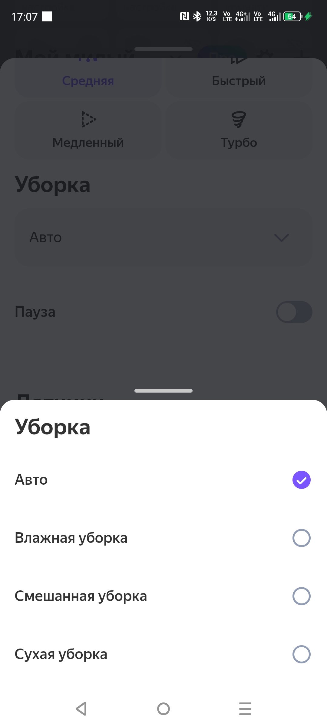 Для режима влажной уборки можно выставить мойку мопов от квадратуры (8, 10 или 12 квадратных метров) или включить мойку по комнатам.