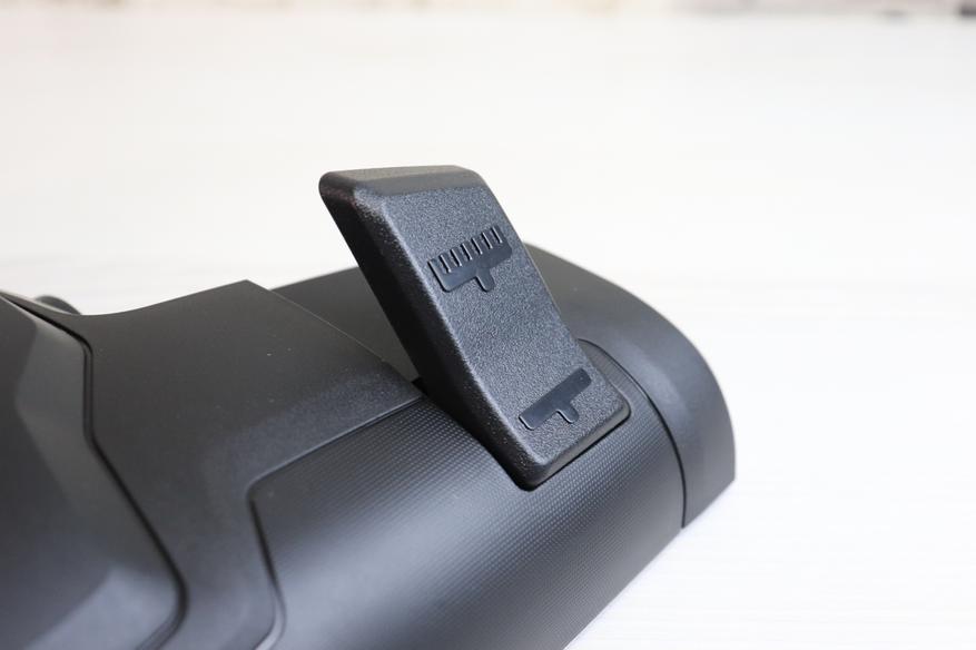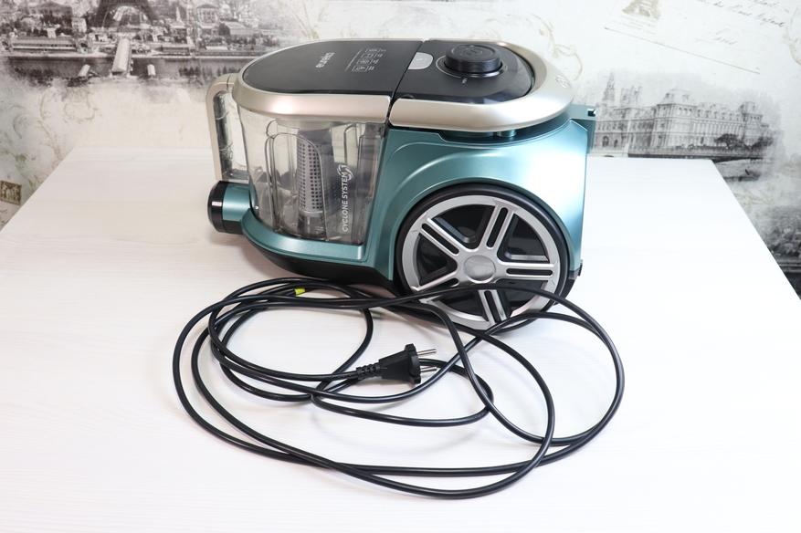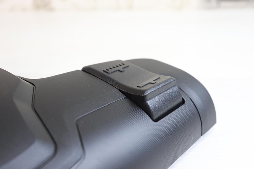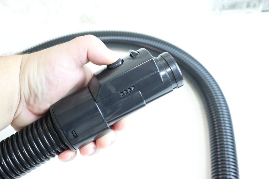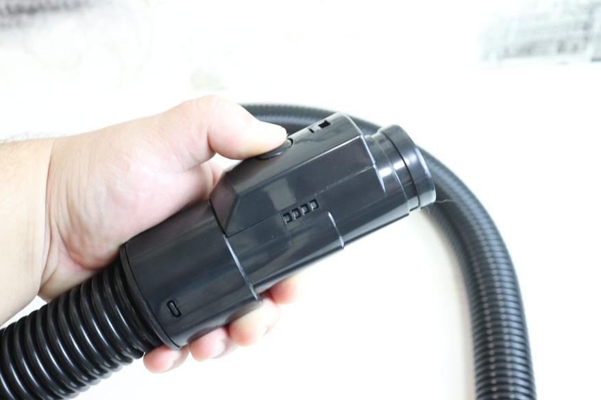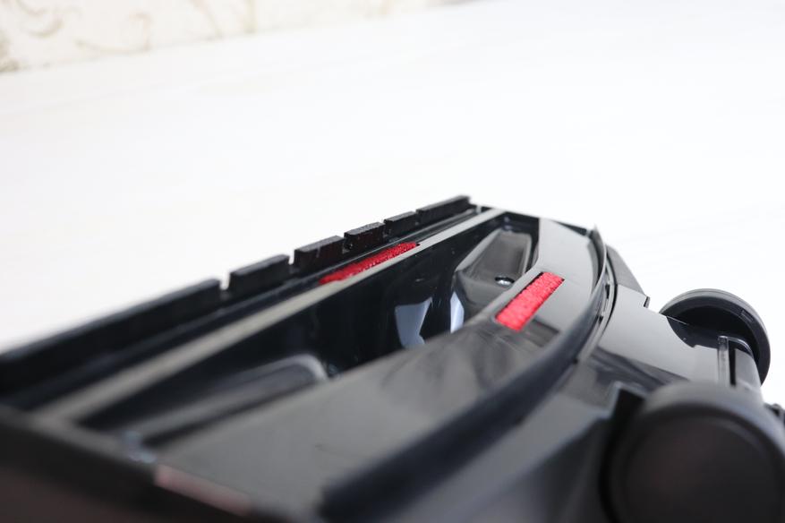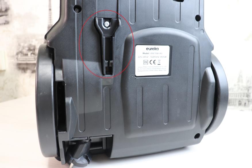 Обратите внимание, что под ручкой имеется кнопка, активирующая пружину для сматывания кабеля питания. Таким образом эту функция можно и нужно активировать, нажимая на ручку до упора вниз. При нажатии на эту кнопку провод начинает очень быстро сматываться, в пылесосе явно стоит очень мощная пружина. На видео в обзоре ниже можно посмотреть детально, как это происходит.