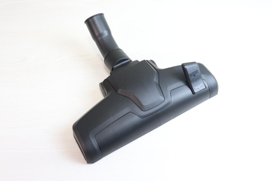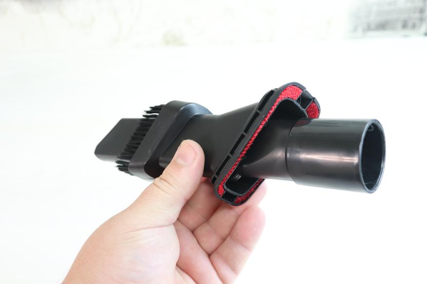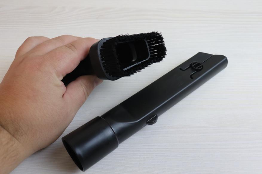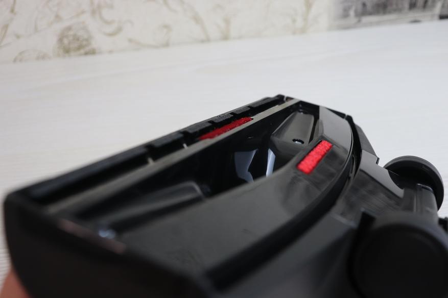 Основная насадка оснащена вспомогательной щеткой, которая выдвигается после нажатия на соответствующий переключатель. Переключатель работает мягко, видимо в его механизме для удобства в использовании установили пружинку. Выдвижные щетки отлично собирают шерсть и подобные загрязнения.