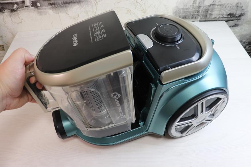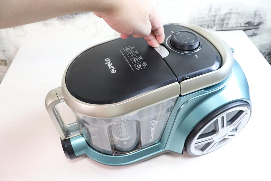 В пылесосе установлен довольно большой контейнер для сбора пыли с объемом 2 литра. Для его снятия нужно нажать на серебристую кнопку, и потянуть контейнер за ручку в противоположную сторону от пылесоса.