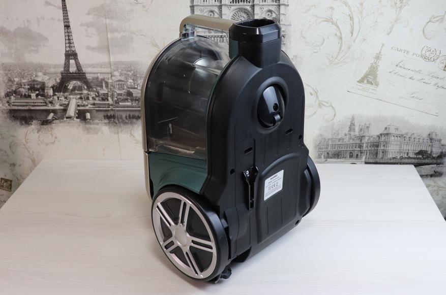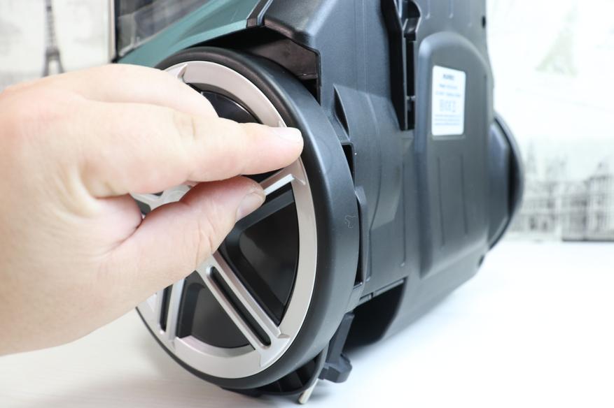 С нижней части пылесоса установлены два основных колеса с прорезиненным покрытием, которое защитит ваше напольное покрытие от царапин при использовании устройства. Также снизу имеется маленькое направляющее колесо и наклейка с техническими характеристиками.
