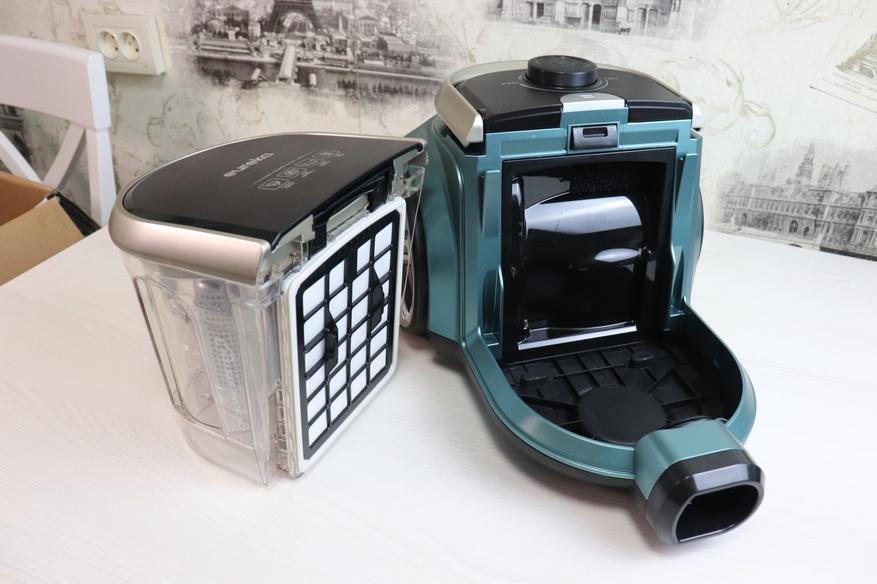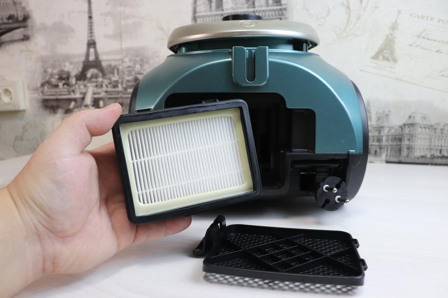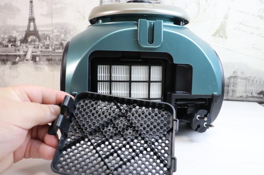 На задней стороне пылесоса установлен второй HEPA-фильтра, который после определенного количества циклов использования пылесоса следует заменить. Но в наших регионах, как правило, их меняют уже вместе с пылесосом. Однако в процессе эксплуатации не лишним будет его изредка вытрушивать от накопившейся пыли. Многие упрекают современные модели за наличие расходников, но подобные фильтры собирают мельчайшие частички пыли и берегут ваше здоровье.