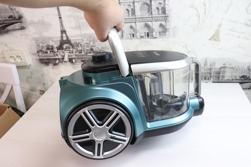 Пылесос имеет классическую конструкцию. На верхней части корпуса имеется удобная ручка для подъема и переноса пылесоса. Я обычно использую пылесос, поддерживая его именно за эту ручку, и передвигаюсь по квартире.