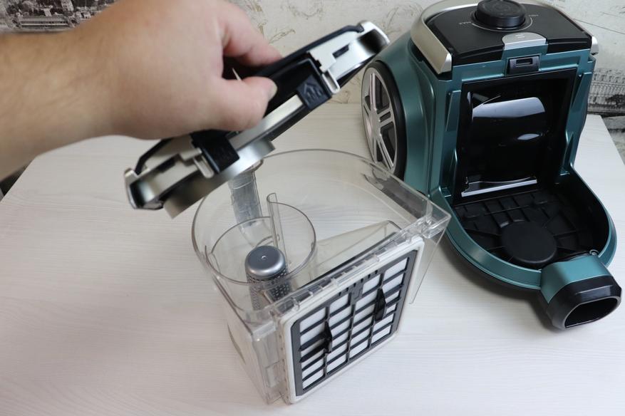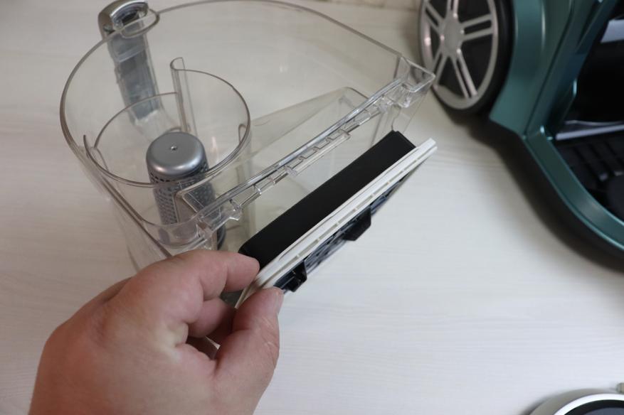 Обращаю ваше внимание, что в пылесосе установлено два HEPA-фильтра, один из них расположен в контейнере, его перед промывкой контейнера нужно снять. Что касается этого фильтра, добавлю, что он надежно фиксируется в своем гнезде при помощи мягких уплотнительных резинок. Фильтр состоит из двух частей, а именно из плотной поролоновой губки, которую можно мыть. И непосредственно материала, который собирает на себе мельчайшие пылинки, его мыть крайне нежелательно.