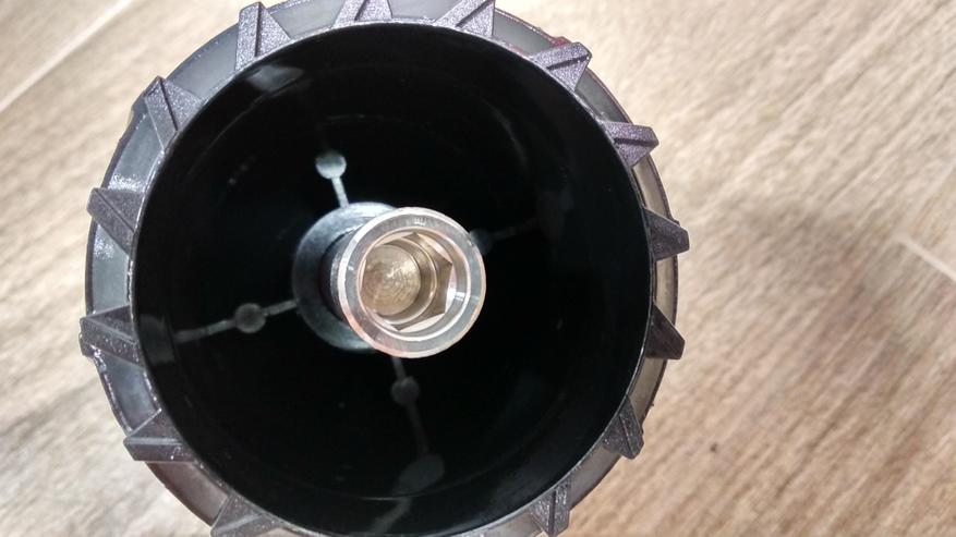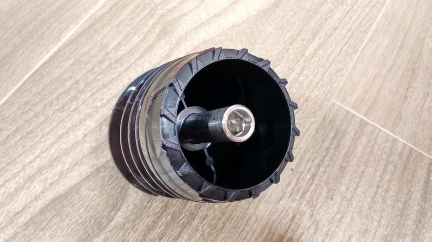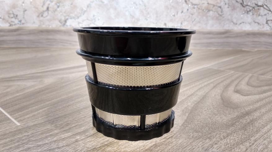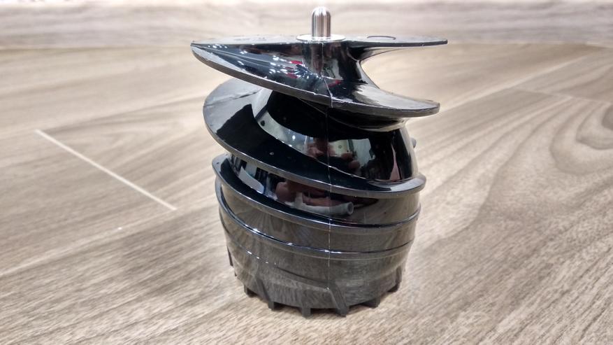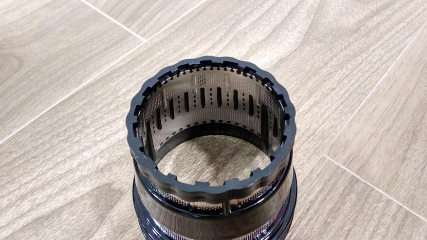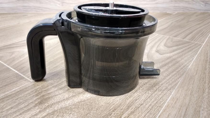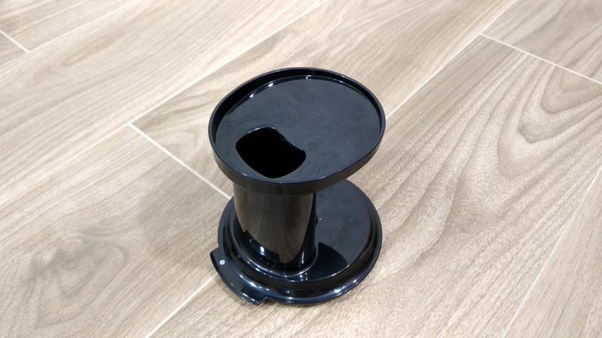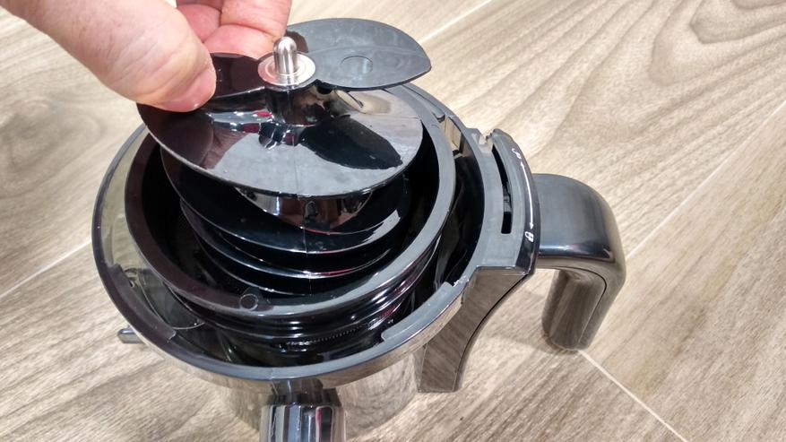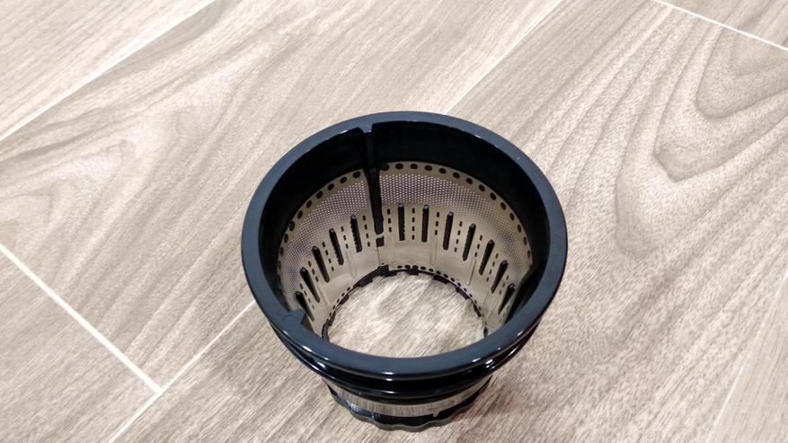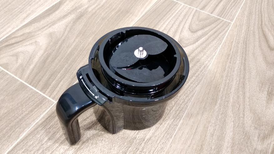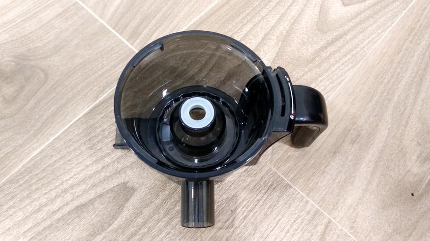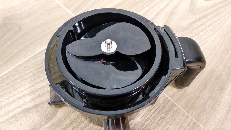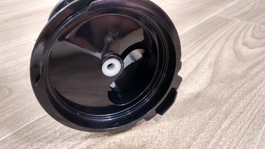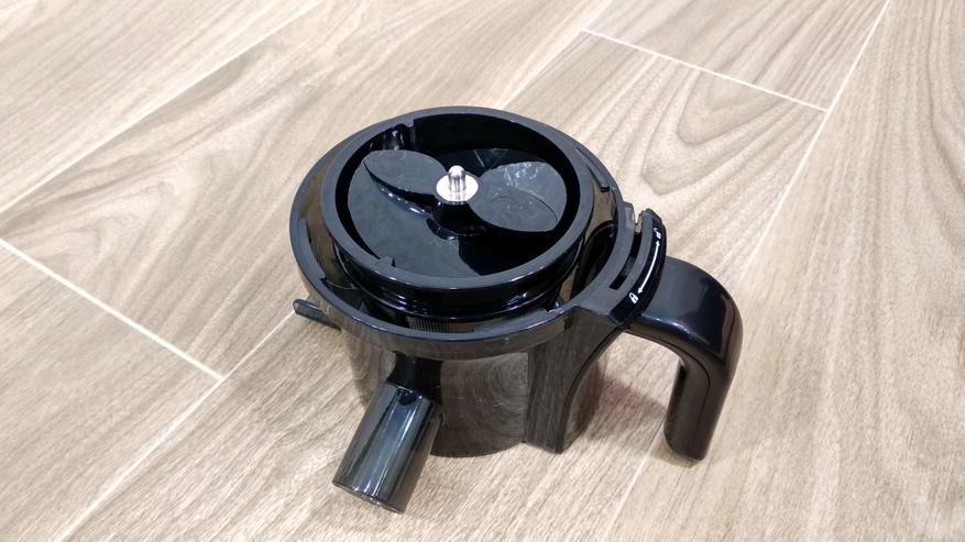 Рабочая чаша собрана, в ней уже стоят фильтр и шнек. Разбирается все очень просто: просто вытягиваем, и все. У всех деталей есть специальные пазы, которые предотвращают неправильную установку. В центре видна еще одна мембрана, защищающая от проникновения сока. На дне у чаши — заглушка, которую можно вытащить и очистить от жмыха. Это очень удобно, потому что без нее вымывать жмых сложно. Выход для сока круглый.
