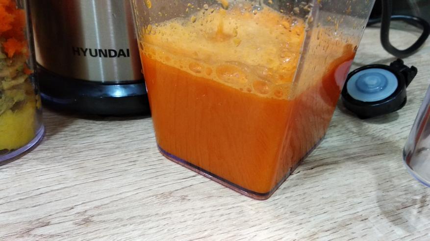 Пробуем все три продукта сразу в деле. На холостом ходу соковыжималку почти не слышно.