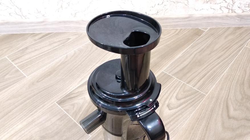 Податчик продуктов прост. Это крышка на рабочую чашу с отверстием для закладки сырья. К нему прилагается толкатель, повторяющий форму отверстия. В центре — кольцо, удерживающее шнек на месте и не позволяющее ему шататься. Для надежного крепления предусмотрены пазы для “замка”.