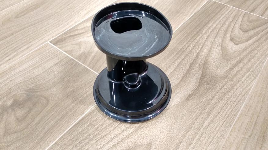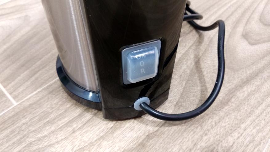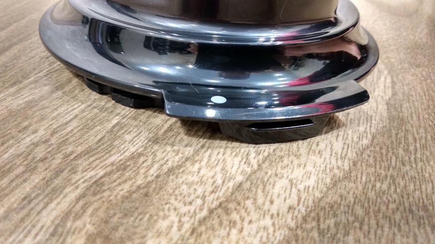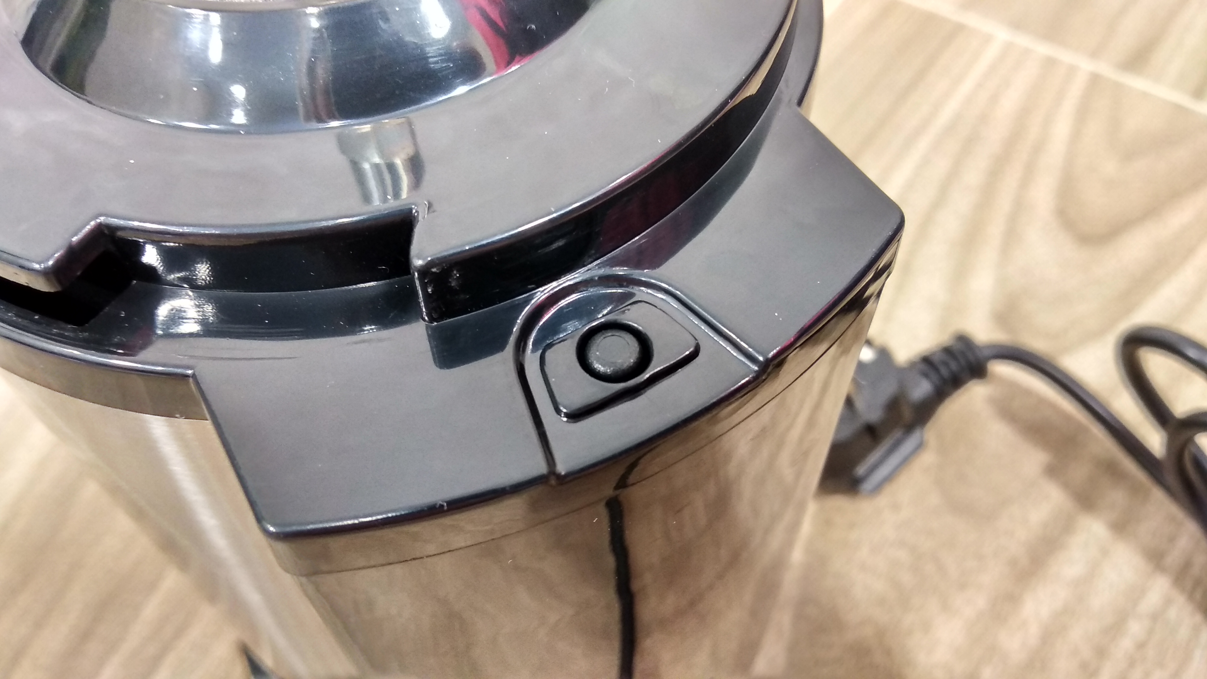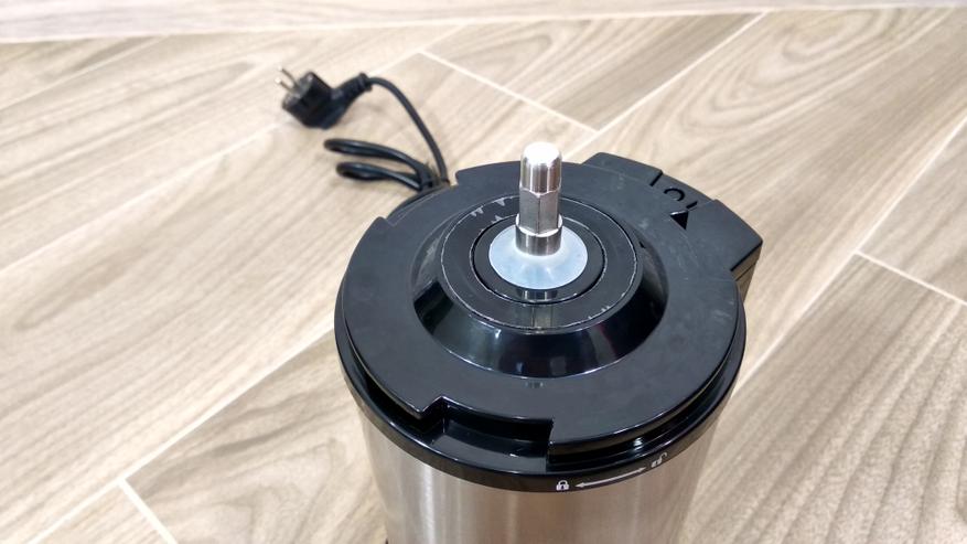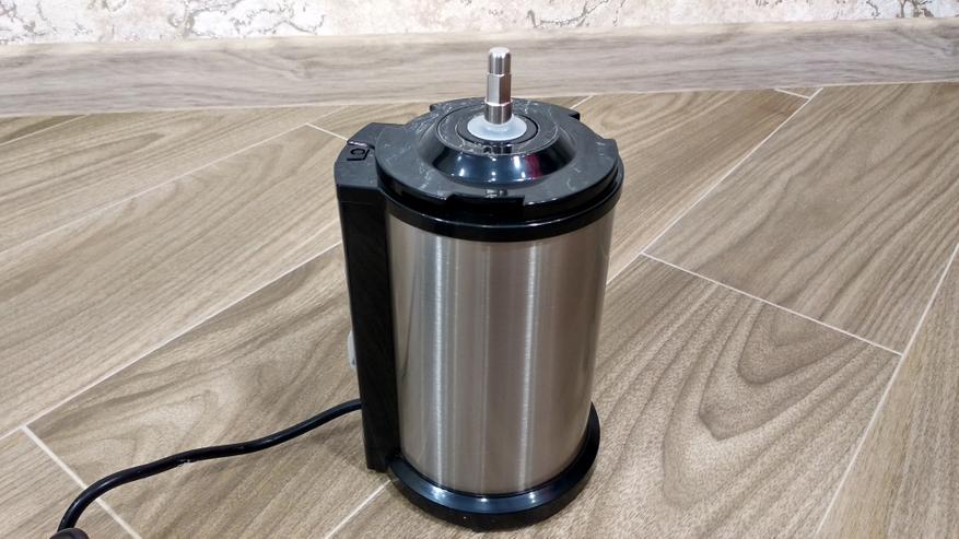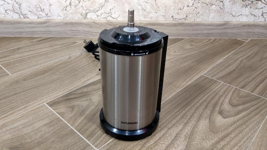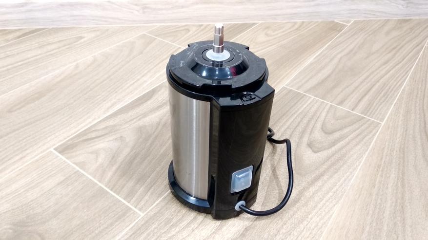 Основной корпус с двигателем выполнен в виде цилиндрической башни из нержавеющей стали с пластиковыми элементами. Сверху расположен приводной вал, защищенный от протекания жидкостей. Такую же защиту от попадания сока имеет и трехпозиционный переключатель. В качестве мер предосторожности есть замок для крепления чаши со шнеком и фильтром, а также концевик, который просто не даст запустить двигатель, если рабочей чаши нет или она установлена неправильно. На дне — прорезиненные ножки и информационная наклейка.