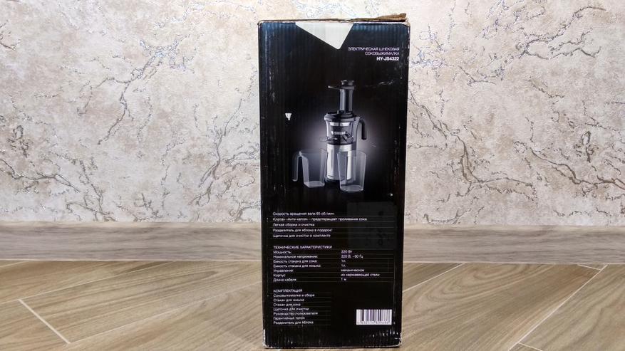 Упаковка соковыжималки выполнена в стилистике компании — преимущественно темные тона.