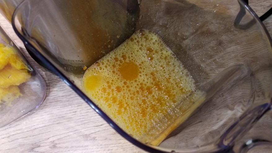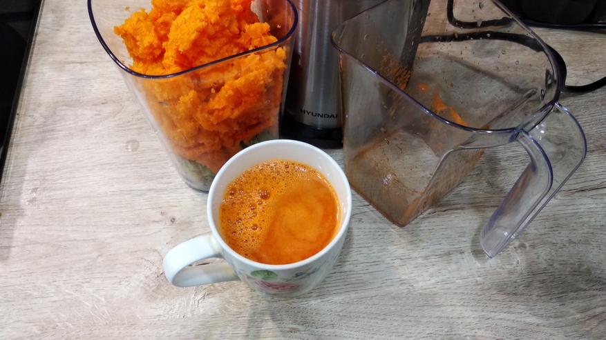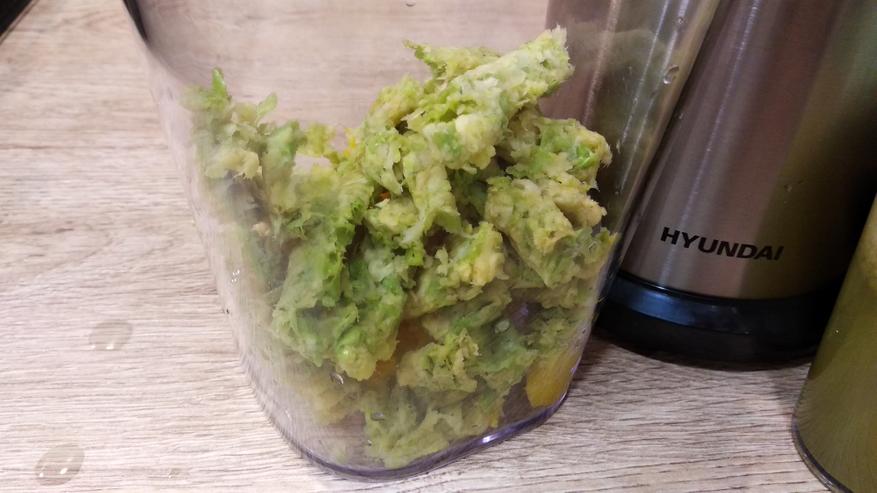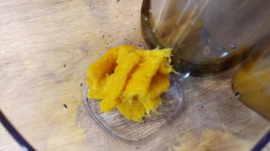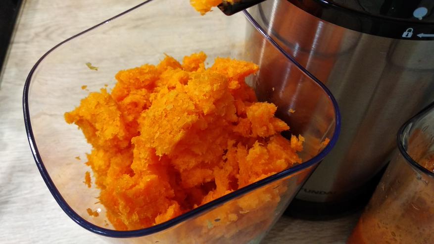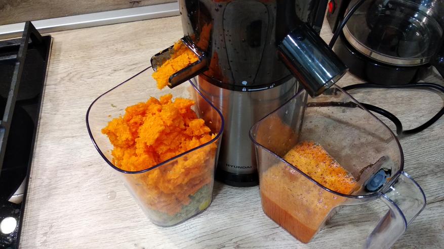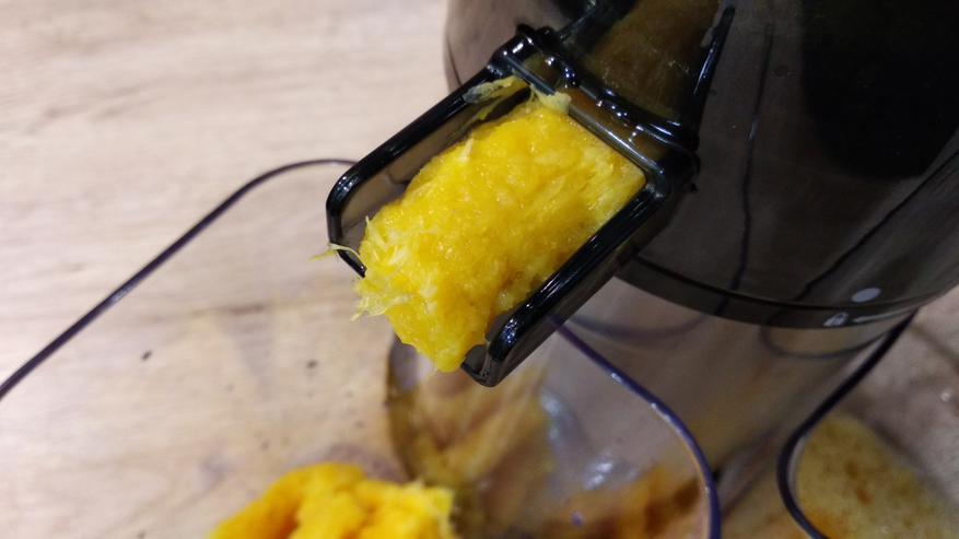 Жмых выходит достаточно сухим даже у апельсина, а у яблок он получился откровенно грубым. У яблочного сока была заметная пена, выход этого сока был самым объемным. Апельсины с яблоками соковыжималка переработала тихо. Морковь далась ей с бОльшим усилием, однако тоже без проблем, сок выходил постоянно, как и жмых.