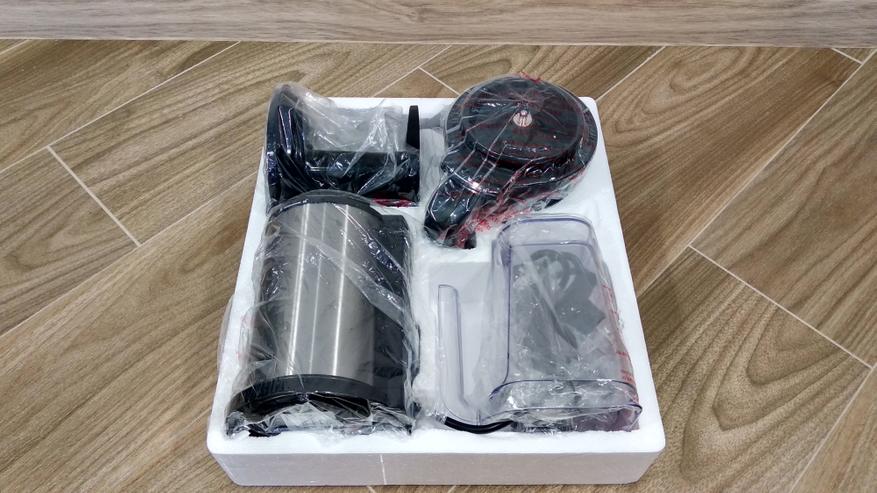 На лицевой стороне достаточно крупно изображено устройство и можно в деталях рассмотреть его конструкцию, ниже обозначены особенности: тихая работа, реверс, нож для яблок в комплекте. На боковом торце дополнительно указаны особенности, характеристики и комплектация. Как можно увидеть, информация предоставлена достаточно подробная. Внутри все находится в пенопластовых половинках, защищающих устройство.