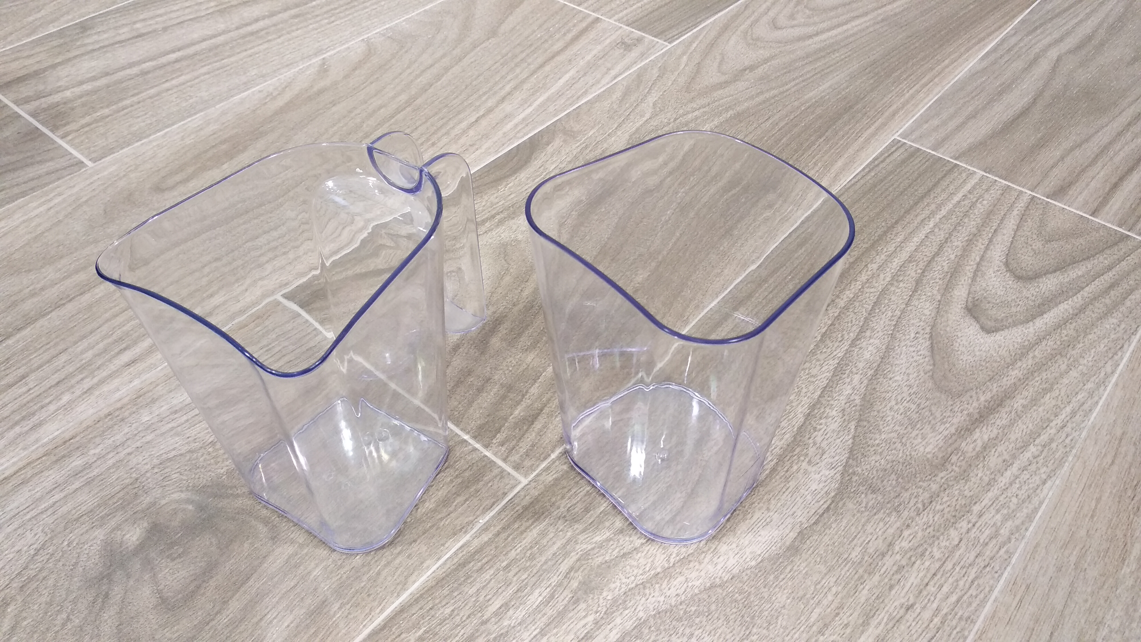 Стаканы для сока и жмыха сделаны из прозрачного пластика. Один из стаканов — с ручкой.