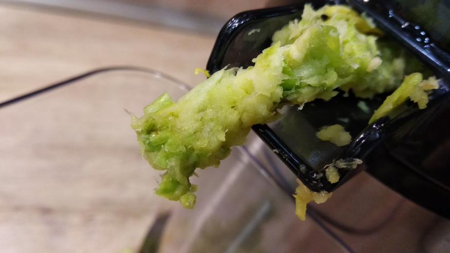 Соотношение объема сока к изначальному весу продуктов будет сильно зависеть от сорта, сезона свежести и прочих моментов, поэтому важнее то, что жмых выходит достаточно сухим. То есть, машина выжимает практически весь сок. Из 517 грамм яблок (4 небольших яблока без сердцевины) получилось примерно 300-310 мл сока.