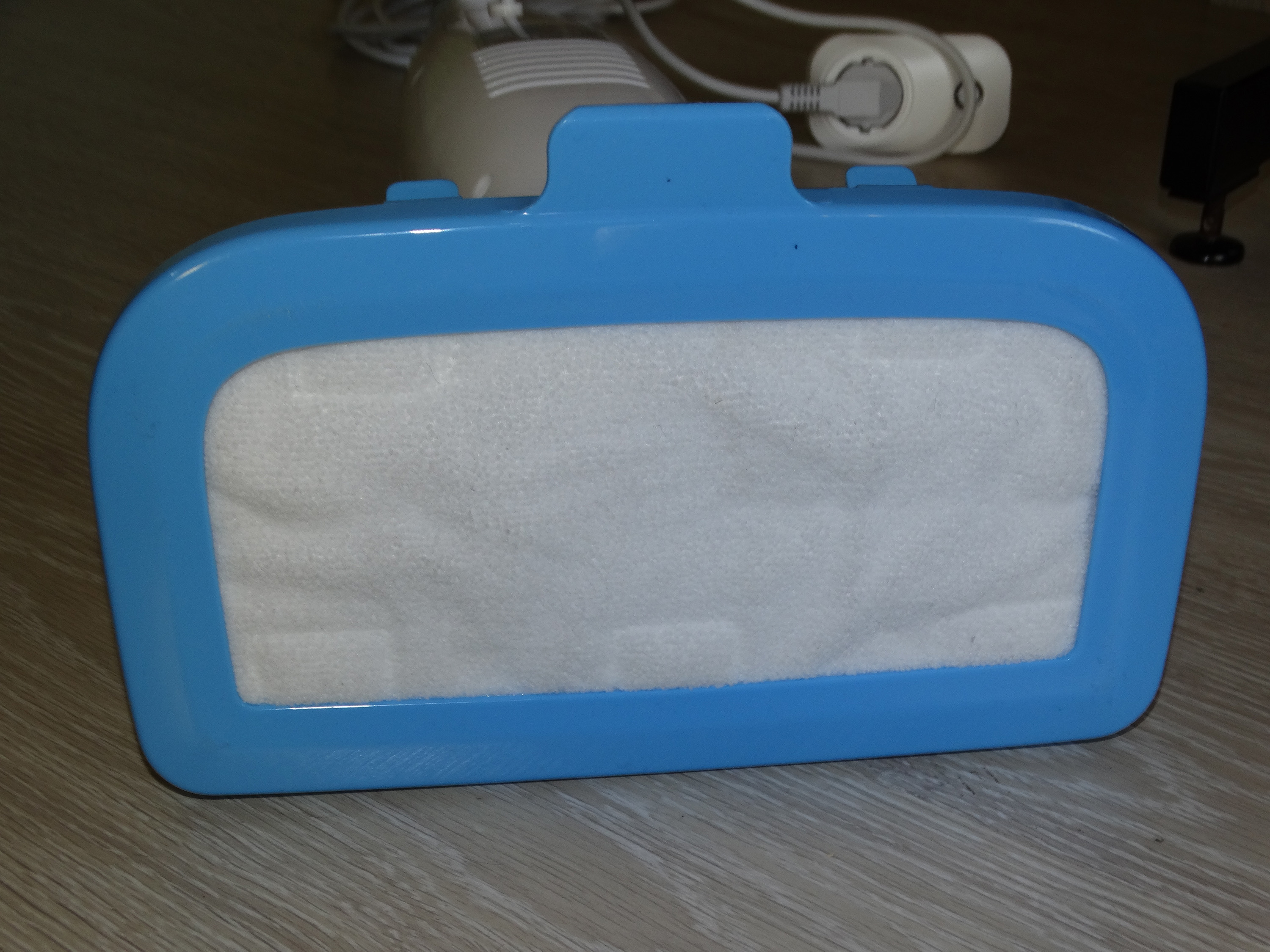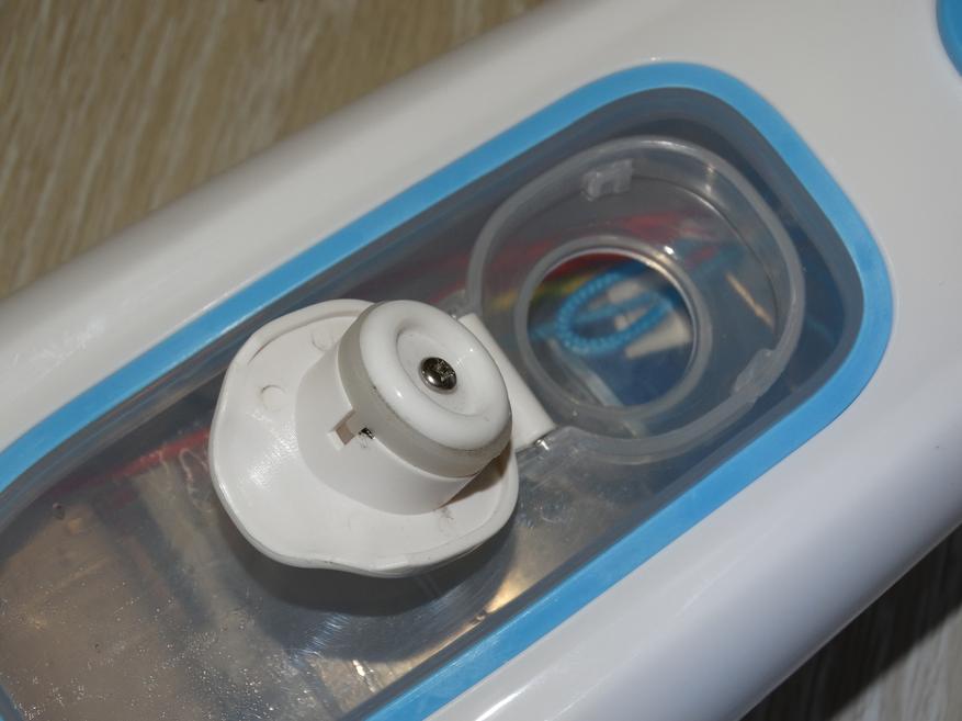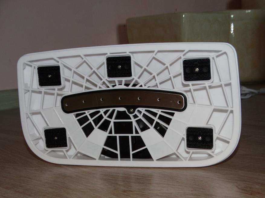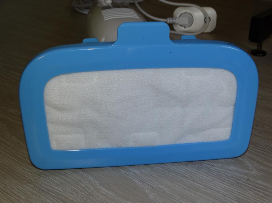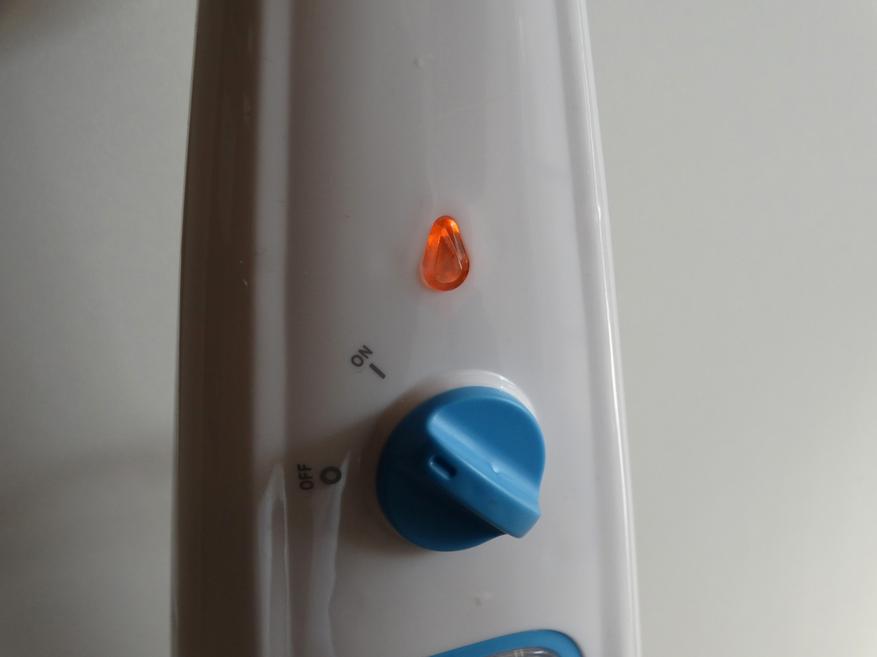 Передняя сторона – механический переключатель, с щелчком фиксирующийся в двух позициях (включено и выключено), световой индикатор работы и прикрытый крышкой резервуар с прозрачным пластиковым окошком, через которое также видно некоторые внутренности прибора, защищённые от воды. Отверстие для заливания воды имеет диаметр 23 мм.