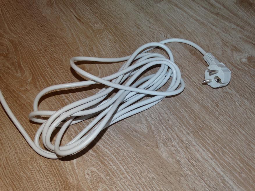 У кабеля привычная для России евровилка с заземлением, а главное его преимущество – большая длина в 4,8 метра, чтобы в не слишком больших помещениях не возникало необходимости использовать удлинитель.