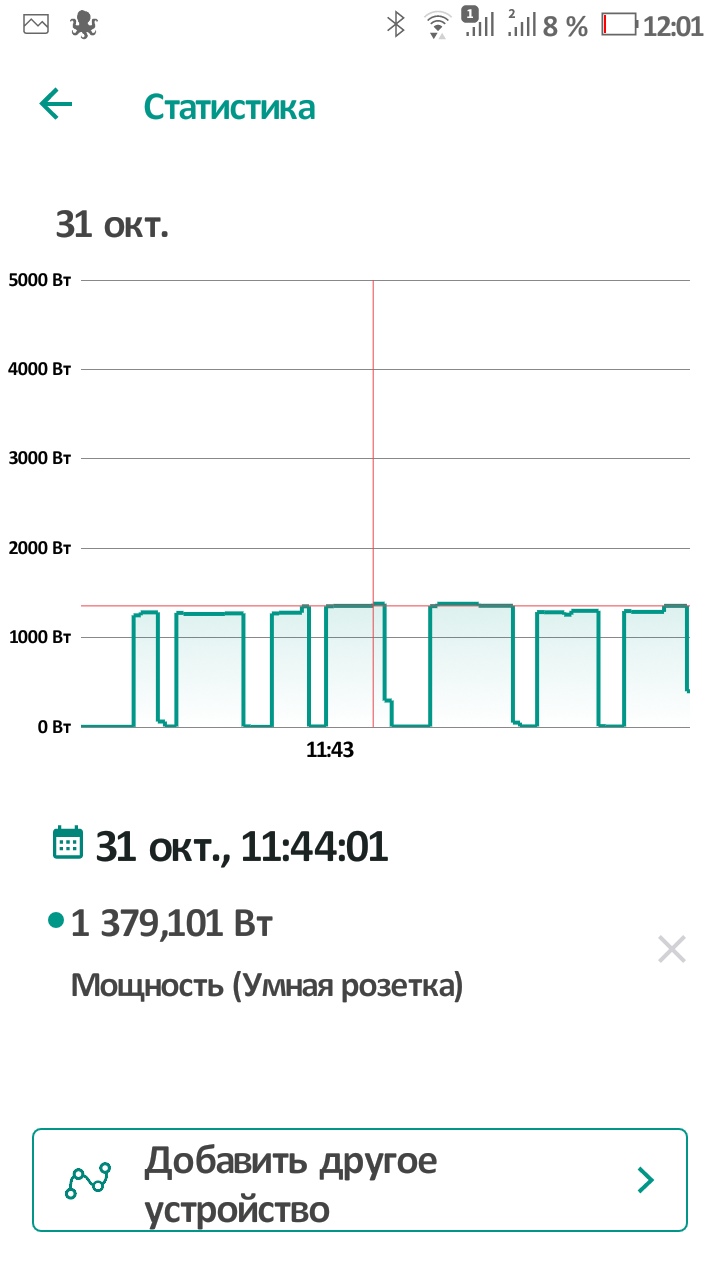 Максимальная потребляемая мощность прибора в сети 240 В составила 1379 Вт, что чуть больше указанного производителем значения в 1300 Вт. По графикам потребления мощности можно заметить, что периодически при работе происходят автоматические выключения (в ходе которых потребляется 5-8 Вт), хотя индикатор состояния непрерывно горит, за исключением тех случаев, когда механический переключатель выставлен в положении «Выключено». В этом случае прибор ничего не потребляет. Обычно включения длятся 35-42 секунды, а выключения – 17-24 секунды, в зависимости от различных факторов.