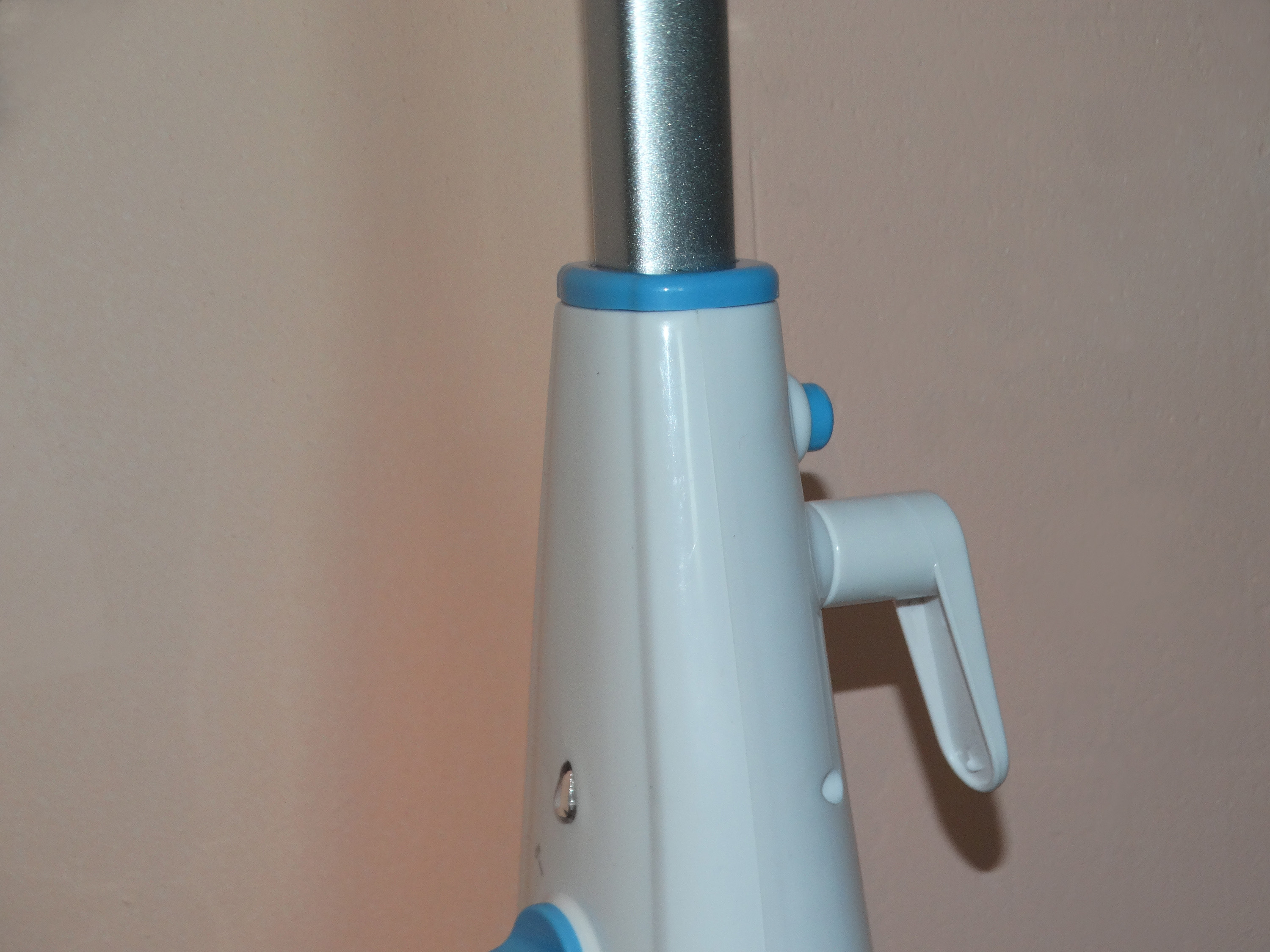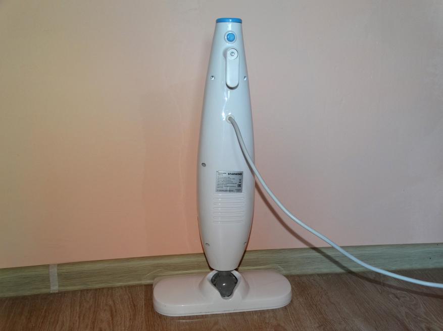 Starwind SSM5333, как для паровой швабры, обладает стандартной формой, внешне напоминая также вертикальные пылесосы. Существует два варианта расцветки – с зелёными или, как в случае с героиней обзора, синими пластиковыми вставками на белом корпусе. Качество сборки стандартное для бюджетного прибора – местами заметны щели между частями корпуса или могут быть слышны негромкие поскрипывания при использовании, но не более того. Прибор выглядит довольно надёжным.