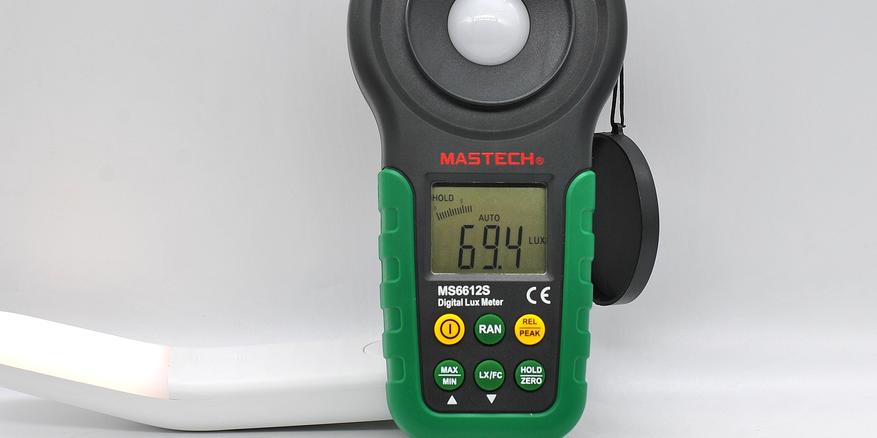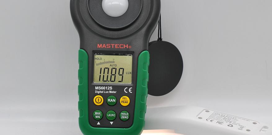 Люксметр MASTECH MS6612S показывает интенсивность освещенности от Baseus DGSUN-GA02 на расстоянии 0,5 и 1 метр. Яркости немного, но ночью достаточно, чтобы найти ручку двери или не споткнуться об игрушки на полу.
