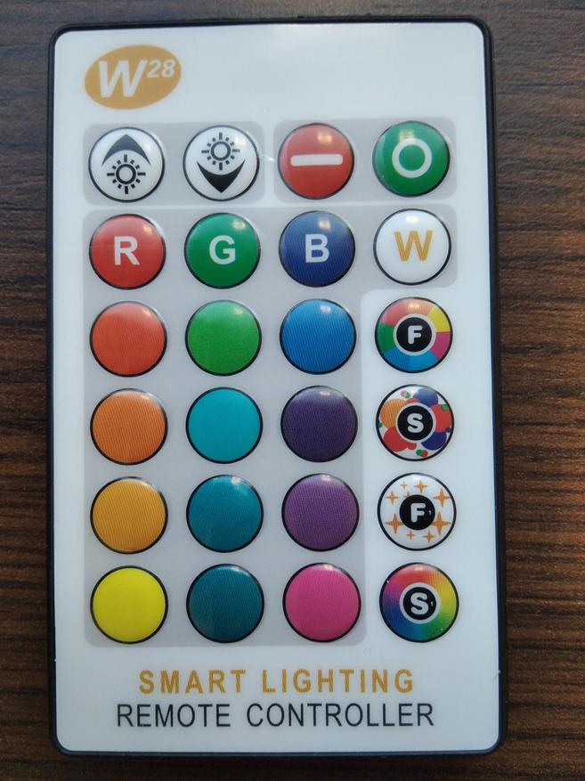 Далее давайте кратко рассмотрим функционал пульта дистанционного управления. Управление очень простое и интуитивно понятное. Верхний ряд кнопок отвечает за включение и выключения ламп, а также за регулировку яркости свечения. Во втором ряду можно включить один из базовых цветов свечения, а также кнопкой «W» включить обычный белый цвет свечения. Все остальные кнопки кроме кнопок с маркировкой «F» и «S» отвечают за включения определенного оттенка света. А вышеупомянутыми кнопками с маркировкой «F» и «S» можно выбирать различные режимы мерцания, среди которых имеется плавная смена цветов, стробоскоп и резкая смена цветов с задержкой примерно в одну секунду.