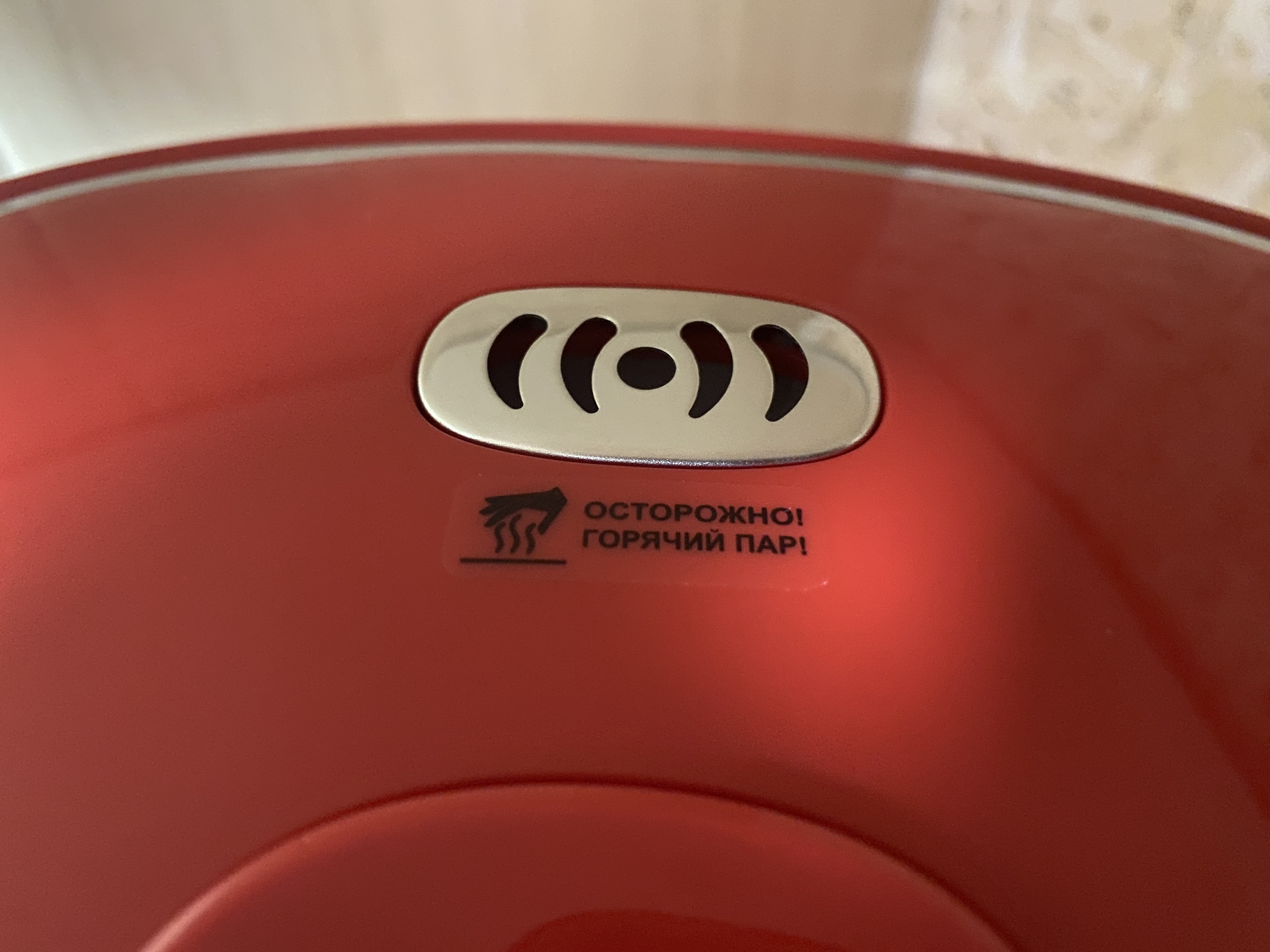 На верхней части также находится массивная крышка, которая не откидывается на петлях как обычный электрический чайник, а снимается полностью при помощи объемной пластиковой кнопки/ручки. На оборотной части крышки имеются отверстия для выпуска избыточного давления горячего пара. Кстати, внутренняя часть крышки сделана из нержавеющей стали.